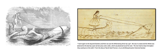 Afbeelding: Links: een promotionele afbeelding uit 1861 van een voorstelling met beloega's in de "Boston Aquarial Gardens" in de Verenigde Staten. Dit is waar de eerste bewuste gevallen van cetacea in gevangenschap voorkwamen. Rechts: een tekening en tekst uit het dagboek van een 11-jarig schoolmeisje die één van deze voorstellingen bijwoonde. Zij schrijft: "Ik ben vandaag weer naar de Aquarial Gardens geweest waar de walvis werd bestuurd door een meisje. Zij stond in een boot en de walvis was aan deze boot bevestig met teugels en een halsband om zijn nek. De mannen moesten de walvis achterna zitten om de halsband om te doen".
