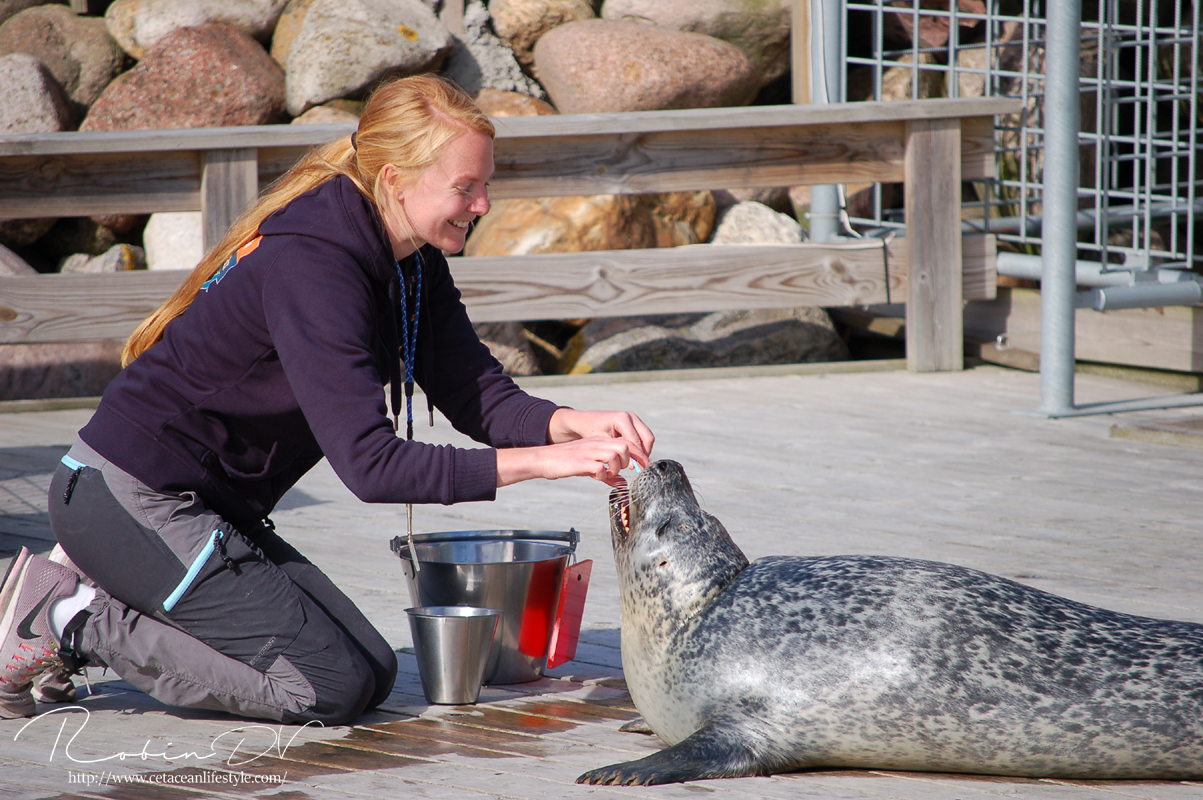 Ook in het Ford&Baelt Center maken de verzorgers gebruik van training. Dit om de dieren gezond en verrijkt te houden. Tijdens de presentaties kun je een heel groot deel van deze trainingen zien. In zowel het Fjord&Baelt Center als bij de Odense zoo in Denemarken wordt gebruik gemaakt van een speciaal soort training. Alle dieren hebben een eigen figuurtje, uitgesneden in rood plastic. Bijvoorbeeld een cirkel, een driehoek, een vierkant of een kruis. De dieren herkennen dit figuur en weten dat ze daar op moeten reageren. Zij zoeken bij het begin van de training naar de verzorger met het juist figuurtje en raken dit vervolgens aan. Nu weten zij dat ze op de juiste plek zijn en ze worden beloond voor het blijven bij het juiste figuur. De trainingen komen erg overeen met andere dierenparken. Er is een deel gezondheidstraining zoals het controleren van de bek, tanden, buikzijde en het schoonmaken van het gebit. Ook worden de zeehonden getraind om iets op het hoofd te dragen. Zo kan er bijvoorbeeld een camera worden bevestigd voor onderzoek. Er is een uitgebreide presentatie tijdens de trainingen waarbij veel wordt uitgelegd, helaas wel in het Deens!
