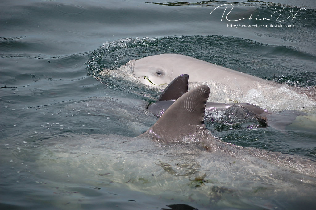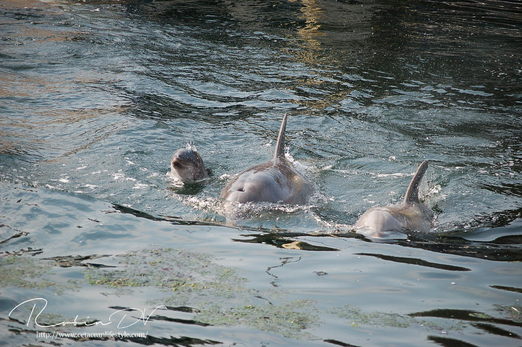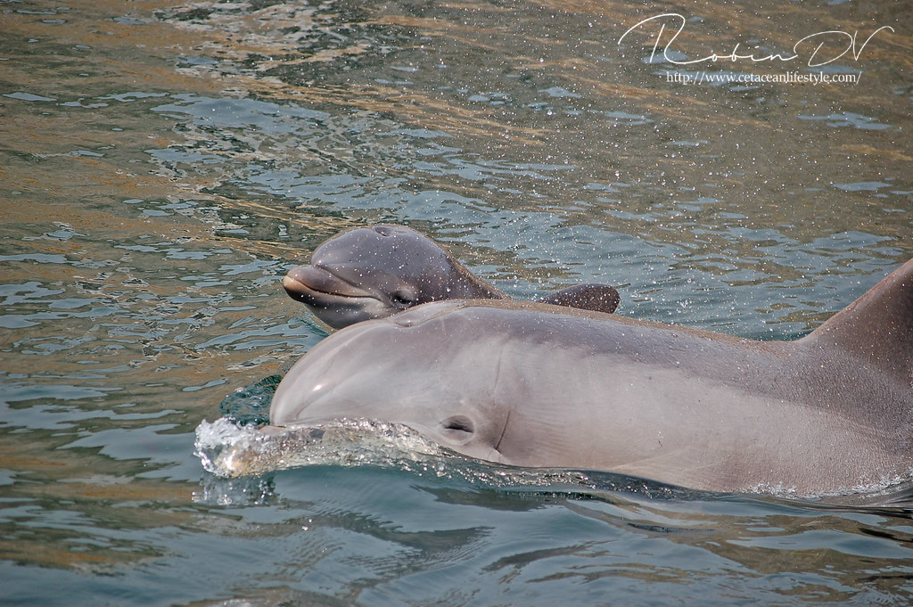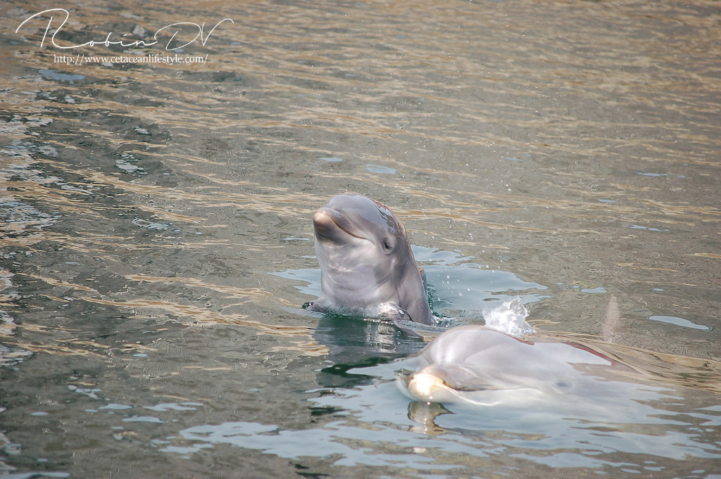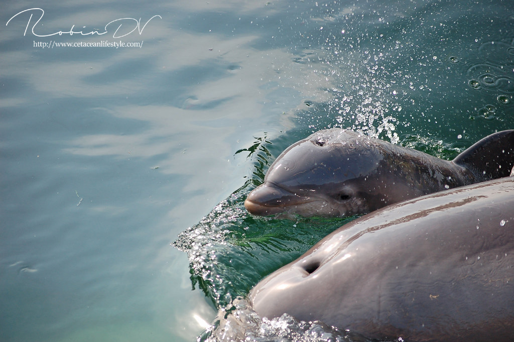 Jonge dolfijntjes komen ter wereld zonder immuunsysteem en hebben nog bijna geen spierweefsel of kracht om te zwemmen. Zij liften als het ware mee in de stroming die de moederdolfijn creëert tijdens het zwemmen. Dit wordt 'slipstreaming' genoemd. Door mee te zwemmen in de slipstream en zelf te bewegen met de staartvin bouwen de jongen zelf ook krachtige zwemspieren op. Aangezien jonge dolfijntjes zo kwetsbaar zijn tijdens de eerste periode na de geboorte is er een groot sterftepercentage. Meer dan de helft van de geboren dolfijnen zowel in het wild als in gevangenschap overleven de eerste weken niet. Dit is een behoorlijk groot verlies als je denkt hoe lang een dracht van een dolfijn eigenlijk duurt. Wanneer een moederdolfijn haar jong verliest is ze meteen weer vruchtbaar en krijgt ze vrijwel zeker precies een jaar later weer een jong. Wanneer het jong overleeft zal de moeder gemiddeld ongeveer pas na drie jaar weer drachtig worden. Hoewel men zich in dierenparken bewust is van de kwetsbaarheid van jonge dolfijntjes, is het erg moeilijk om hier zelf verbetering in te brengen, aangezien de jonge dolfijn zelf een immuunsysteem en kracht op moet brengen door het nuttigen van de melk en het zwemmen met het moederdier. Wel wordt alles zeer nauwkeurig gemonitord en ingegrepen wanneer dit nodig is. Naast James heeft Roxy nog drie zonen gekregen: Damsxi, Rocco en Storm. Ook heeft ze een dochter genaamd Parel. Een zeer ervaren moeder dus! Hier een aantal van mijn favoriete foto's van het stel: