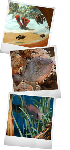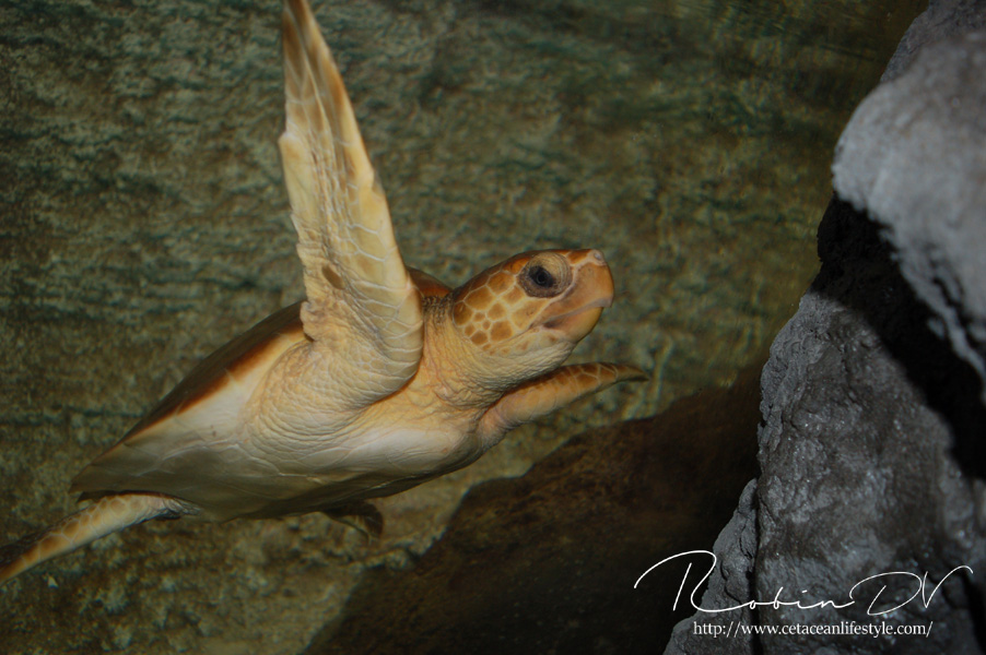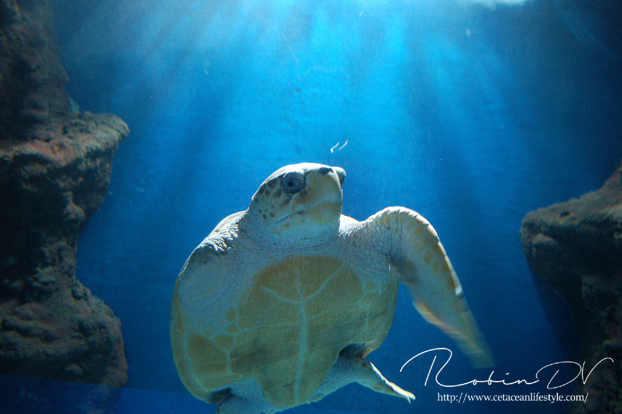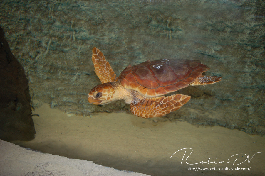 Hoewel het een klein aquarium is, hebben ze alle 'populaire' soorten. Haaien, grote roggen, zeeschildpadden, clownvissen en een octopus om er maar een paar te noemen. Ook hebben ze echter vissen en andere dieren die je juist niet zo vaak ziet. Aan het begin van de route zie je verschillende soorten die alleen bij Lanzarote of de andere Canarische eilanden voorkomen. Dit vond ik een hele leuke toevoeging. Er waren twee hele grote en vooral ook speelse trekkervissen, waar ik me alleen al uren mee zou kunnen vermaken. Qua haaien hebben ze de zwartpuntrifhaai, witgestippelde bamboehaai en zebrahaai. Ook een enorme pijlstaartrog en arendsroggen zwemmen in het grote bassin. Wat mij vooral opviel is dat de dieren heel goed zichtbaar zijn. Er is geen één aquarium waar je echt moest zoeken. Zelfs de octopus, (die normaal erg verstopt zitten) kon je heel goed zien. In verschillende bassins werd er gebruik gemaakt van glazen bollingen, wat zowel verrijking is voor de dieren als heel leuk voor de bezoekers. Als kers op de taart neemt het Aquarium van Lanzarote actief deel aan de opvang en rehabilitatie van zeeschildpadden. Deze schildpadden komen veelvuldig voor in de omgeving. Vaak raken ze verstrikt in visnetten of plastic afval. Deze schildpadden worden vervolgens opgevangen en uiteindelijk weer uitgezet in het wild. Tijdens ons bezoek waren er verschillende jonge zeeschildpadden in rehabilitatie (Dikkopschildpadden). Helaas is het soms ook zo dat een dier te gewond is geraakt en niet meer kan terugkeren naar zee. Dit is het verhaal van schildpad "Lourditas". Zij werd gered uit een visnet in 2012. Ze was zodanig gewond geraakt dat er amputatie nodig was van haar vinnen, beide aan dezelfde kant. Hierdoor heeft ze een duidelijke handicap. Zij leeft in het grote bassin in permanente opvang. Ondanks alles wat ze heeft meegemaakt was ze bijzonder speels en kwam ze echt kijken bij het glas en ook echt even spelen. Zeeschildpadden zijn zo'n mooie, rustige en intelligente dieren! Echt goed om te zien dat dit aquarium ze opvangt. Al met al is het een klein aquarium, maar de moeite waard om te bezoeken in mijn ogen. Boven: Een impressie van de collectie dieren in Lanzarote Aquarium. Zeeschildpad Lourditas verblijft er in permanente opvang na een dubbele amputatie.