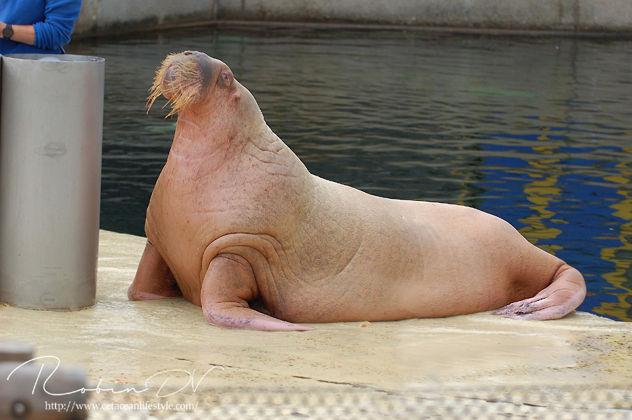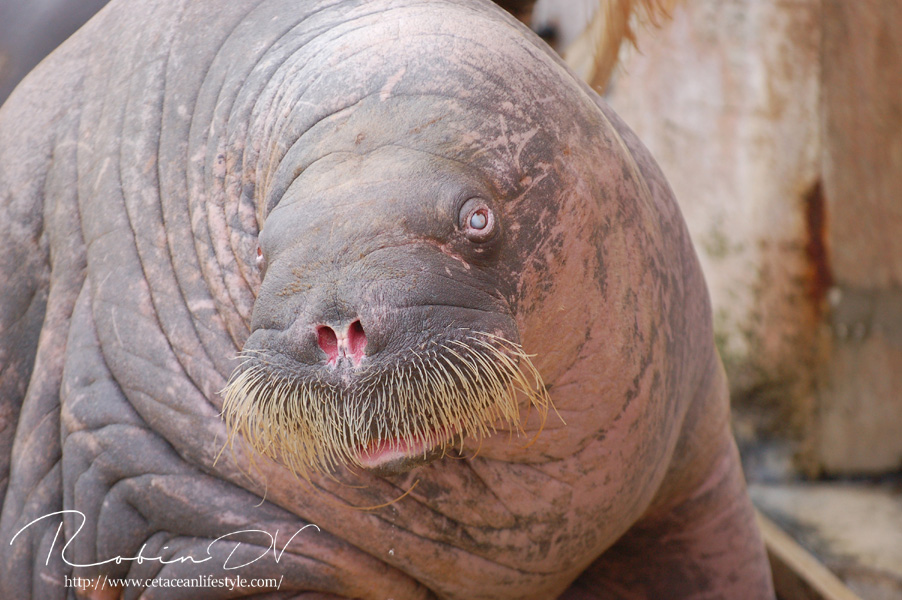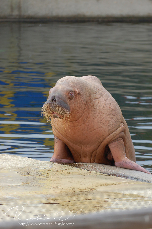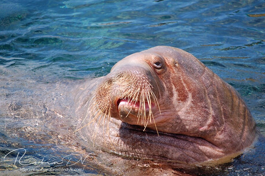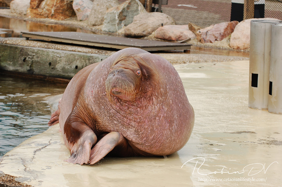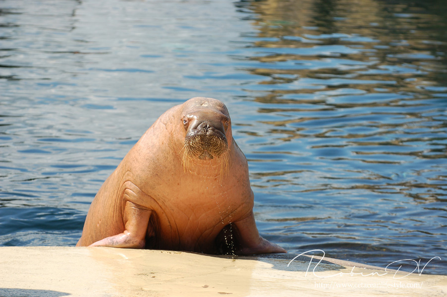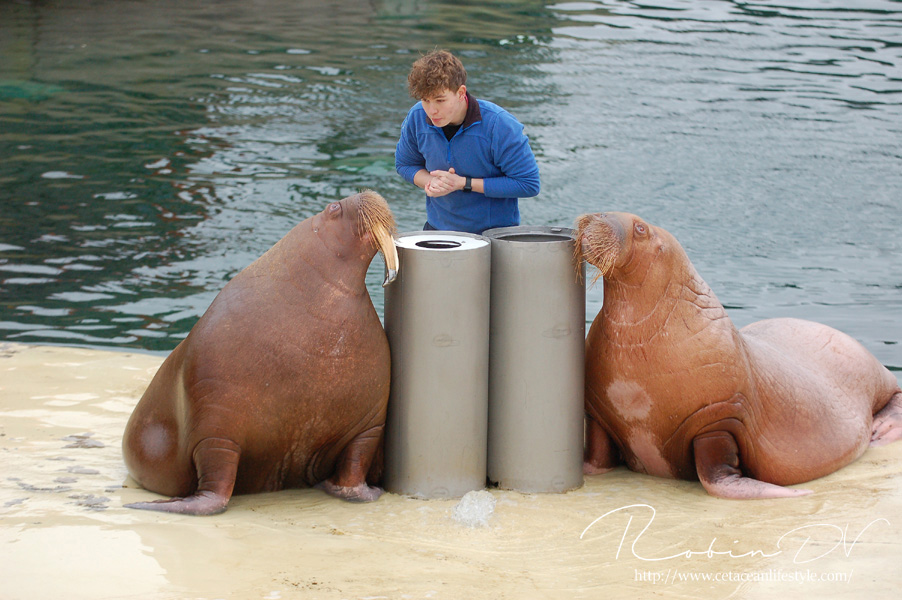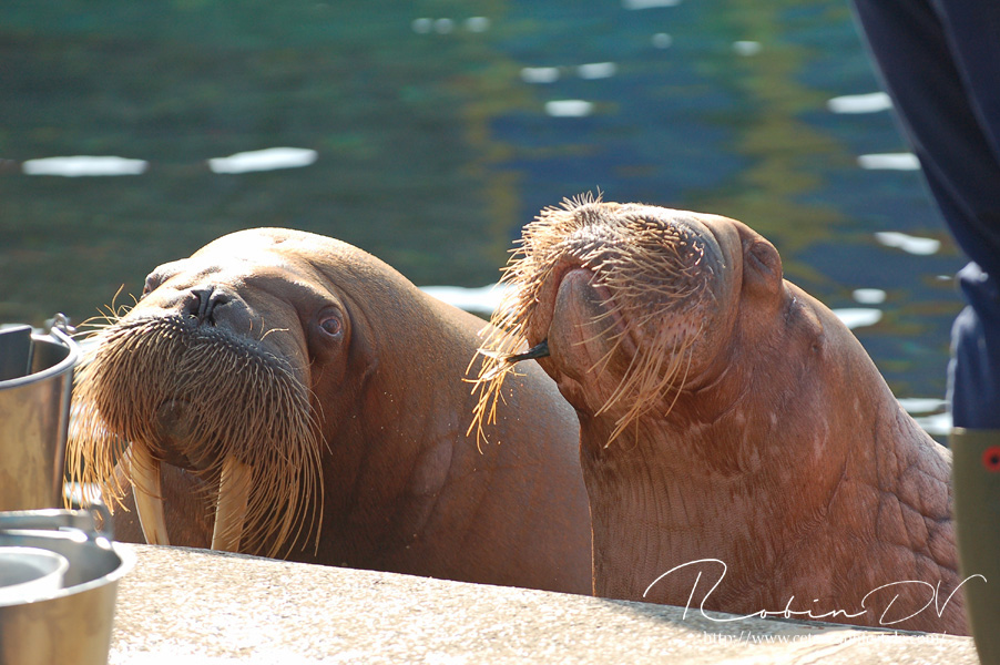 De walrussen van het Dolfinarium zijn als jonge dieren naar het park gekomen. Op 8 juli 1976 opende het Dolfinarium haar walrussenverblijf: Nova Zembla. In dit verblijf kwamen drie jonge walrussen van twee jaar oud genaamd Pjotter, Katinka en Ivan. Zij verbleven sinds 1974 achter de schermen in de Koepel, nadat ze via de dierentuin van Moskou uit Siberië naar Harderwijk gekomen waren. In 1976 werden de dieren te groot en verhuisden zij naar hun eigen verblijf. Dit verblijf bevatte 260.000 liter water en had achter het droge gedeelte een aantal separatieverblijven. Qua uitstraling moest een Noordpool gebied nabootsen, met nagemaakt ijsschotsen in het water. Ook voor dit gebied werden de walrussen uiteindelijk te groot, vooral na enkele gezinsuitbreidingen! In 2005 zijn zij verhuisd naar het huidige verblijf, de walrussenwal. In het oude verblijf van de walrussen leven nu de bruinvissen. Uniek aan de groep in het Dolfinarium zijn de fokresultaten, het Dolfinarium is één van de weinige parken in de wereld die meerdere malen succesvol heeft gefokt met walrussen. Drie keer werd er een gezond jong geboren in waarvan er nu nog één in het park leeft. De walrussengroep bestaat op dit moment uit drie dieren en het Dolfinarium is hiermee dus één van maar drie parken in Europa waar je walrussen kunt zien. Boven: De walrussen in het Dolfinarium. De walrus is de grootste vinpotige ter wereld. Op drie plekken in Europa kun je deze imposante en bijzondere dieren zien.