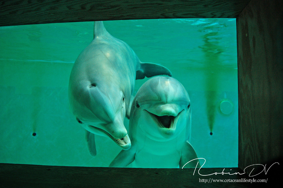 Dolly en Donna waren de eerste baby dolfijnen die ik echt bewust heb meegemaakt in mijn Duisburg tijd. Dolly is de oudste van de twee halfzusjes en is geboren op 4 augustus 2007. Het nieuws van haar geboorte was zeer groot en trok veel belangstelling. De laatste jonge dolfijn die voor haar in Duisburg werd geboren was het mannetje Duke in 2001, hij overleed helaas in 2003 na het eten van verontreinigde vis. Hiervan was het park zo geschrokken dat ik me nog kan herinneren dat ze een hele tijd de koppen van de vissen moesten verwijderen en weggooien. (Er werd namelijk gedacht dat de verontreiniging zich concentreerde in de kop van de vis). Dolly's ouders zijn Ivo en Delphi, zij leven allebei nog steeds in Duisburg. Dolly was een echte publieksfavoriet vanaf het begin. Donna werd vervolgens geboren op 17 september 2007. Haar ouders zijn Ivo en Pepina. Ook Pepina leeft nog steeds in Duisburg. Dolly & Donna zijn dus halfzussen en echt samen opgegroeid. Ik heb ontzettend mooie en leuke herinneringen aan die tijd en hoe speels de jonge dolfijntjes waren. Ik heb heel veel met ze gespeeld en misschien wel duizenden foto's van ze zowel voor als achter de schermen. Het waren toen echt mijn favoriete diertjes. Ze hadden allebei ook een heel ander karakter. Dolly was veel nieuwsgieriger en speelser (soms zelfs een beetje stout!) en extravert, terwijl Donna wat terughoudender was en wat meer de kat uit de boom keek. In 2018 bezocht ik dames al eens en zag ik ze stralen in de "Dolphin Lagoon" . Nu had ik echter ook de kans om ze van veel dichterbij te zien in het oude dolfinariumgebouw. Ze zijn echt ontzettend gegroeid en echt volwassen geworden! Het blijft heel raar om te zien dat ze zo ontzettend zijn gegroeid terwijl ze in je hoofd nog steeds 'de baby's' zijn. Het zijn nu echt volwassen vrouwtjesdolfijnen. Hun karakters zijn nog steeds ongeveer hetzelfde. Ik had verschillende langdurige interacties met ze en Dolly is nog steeds het meest speelse dier met hele sterke mimiek. Donna was ook heel erg geïnteresseerd, maar observeerde vooral. De halfzusjes zijn nog steeds heel erg close en zwemmen eigenlijk altijd samen, ook worden ze vaak samen getraind. Ze zijn op het oog heel makkelijk uit elkaar te houden door dezelfde kenmerken die ze vroeger ook hadden; Dolly is veel groter en forser gebouwd. Haar kop en nek zijn veel grover dan de fijne snuit van Donna. Ook heeft Dolly nog steeds een kenmerkend litteken over haar oog lopen, deze had ze als kalf al en maakte het zo dat we haar liefkozend 'scarface' noemden in Duisburg. Ze zijn ook echt allebei het evenbeeld van hun moeders in Duisburg. Boven: Dolly en Donna, halfzusjes die in 2014 verhuisden vanuit Zoo Duisburg, waar ze in 2007 werden geboren. Beide dieren maken het goed en zijn nog steeds erg close.