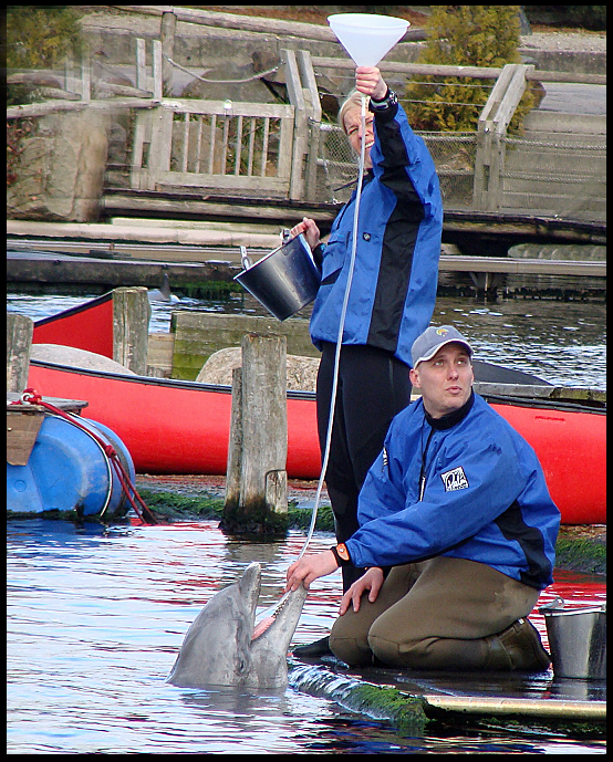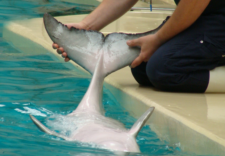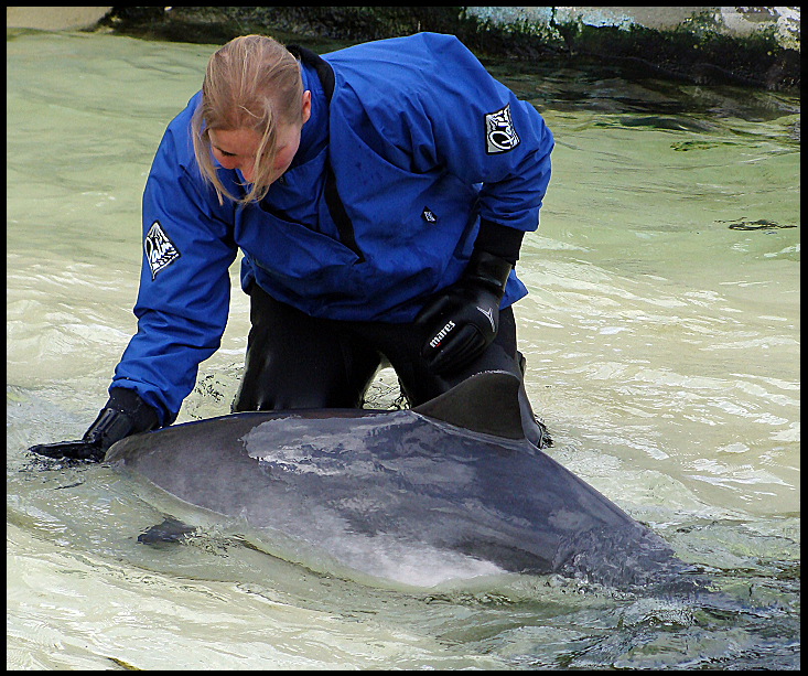 In mijn vorige blog had ik het over de training van zeezoogdieren, met name de target training. De belangrijkste training is echter de gezondheidstraining. Deze training wordt standaard uitgevoerd in vrijwel alle parken die cetacea houden. De gezondheidstraining is een serie van gedragingen waardoor het mogelijk wordt een dier vrijwillig te onderzoeken en zelfs te behandelen wanneer dit nodig is. Zo wordt er bij dolfijnen bijvoorbeeld gekeken naar de tanden, ogen, het blaasgat, de buikzijde, er wordt temperatuur opgenomen, het dier wordt gewogen en er wordt zelfs vrijwillig bloed geprikt. Door deze training regelmatig uit te voeren raken de dieren gewend aan deze procedures en is het makkelijk de dieren te monitoren en gezond te houden. De gezondheidstraining wordt in dierenparken bij een groot aantal soorten uitgevoerd. De gezondheidstraining van cetacea is echter wel de meest geavanceerde en meest stressvrije methode. Het dier werkt in direct contact met de verzorger/trainer en hoeft niet te worden verdoofd om bijvoorbeeld bloed te prikken, gewicht te bepalen of het dier te transporteren. Zelfs kleine medische ingrepen kunnen worden uitgevoerd. Het dier wordt continu beloond en koppelt dus geen negatieve ervaringen aan deze training.