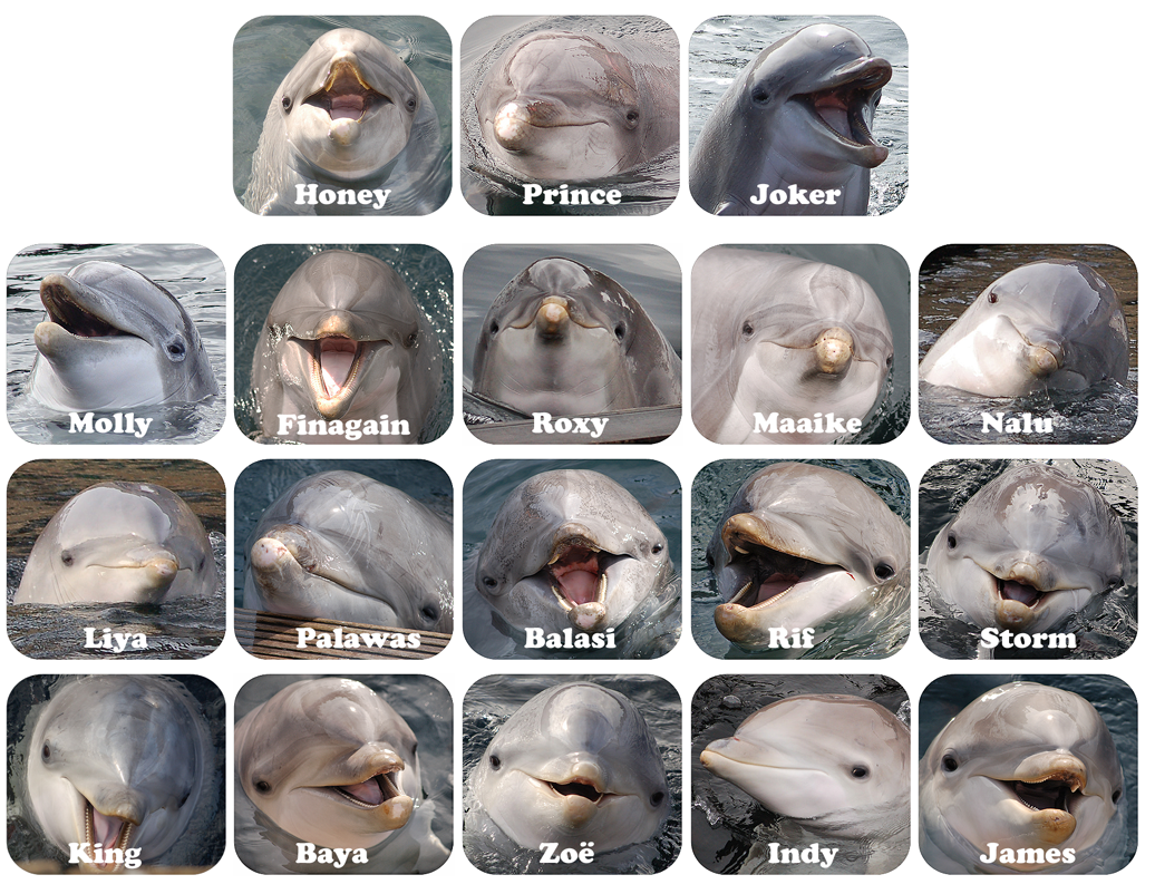 Hoewel dolfijnen op het eerste oog erg op elkaar lijken heeft ieder dier zijn of haar eigen unieke uiterlijk en specifieke karakter waardoor ze door de trainers, maar ook door de vaste bezoeker makkelijk uit elkaar te houden zijn. Hoe meer je de in het park komt en de tijd neemt de dieren te bestuderen, hoe beter je ze zal gaan herkennen en zelfs gaan merken dat dieren die familie van elkaar zijn ook op elkaar lijken! Hier volgt een korte introductie en een stukje geschiedenis van de dieren die op het moment in de dolfijnendelta leven:
