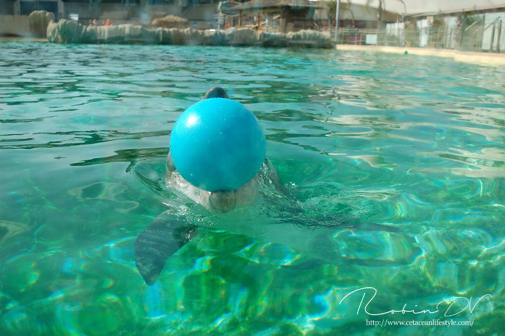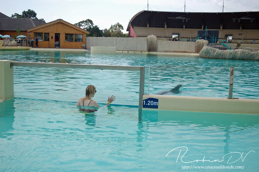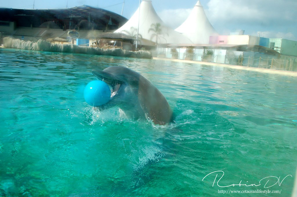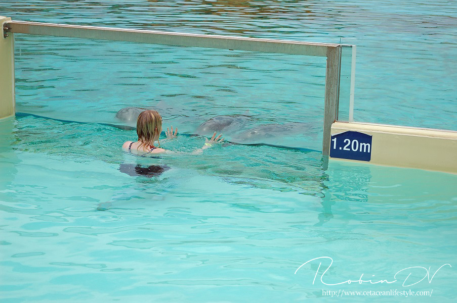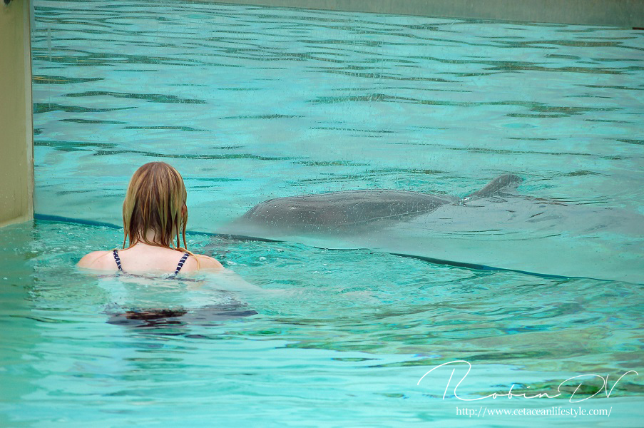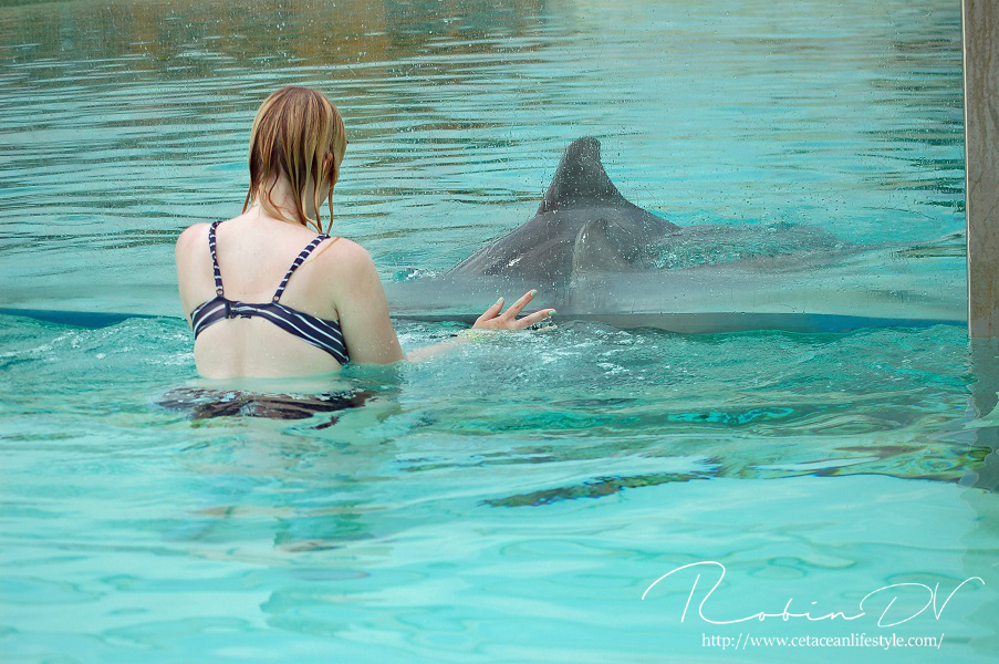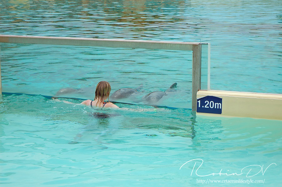 Het allergaafste was natuurlijk het zwemmen langs de dolfijnen! Je ziet ze, hoort ze en andersom ook. Omdat ik de eerste en enige was in het bassin waren ze ook ontzettend speels! Ze kwamen naar mij toe en speelden meerdere keren zo'n 10 á 15 minuten lang met me door het glas. Ook kwamen ze toen ze later ballen hadden, deze ballen brengen en begonnen ze deze over te gooien naar mij. Het is zo ongelofelijk leuk om 'vrij' contact te hebben met deze dieren! Zonder visbeloning, zonder ervoor te betalen zoals in een programma. Gewoon pure speelsheid en mooie momenten tussen jou en de dolfijnen. Ik moet hier wel bij vermelden dat toen het zwembad later in de week open ging en er veel meer mensen waren de dolfijnen niet steeds naar het glas kwamen om met iedereen te spelen. Ze zwommen toen gewoon langs het glas af (wat ook heel gaaf is!) er is dus geen garantie dat de dieren met je komen spelen. Als de dieren de hele dag mensen zien zullen ze uiteindelijk ook geen interesse meer hebben natuurlijk. Omdat ik op dat moment de enige was en waarschijnlijk de eerste in een lange tijd waren ze wellicht een stuk speelser dan normaal.