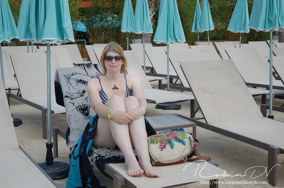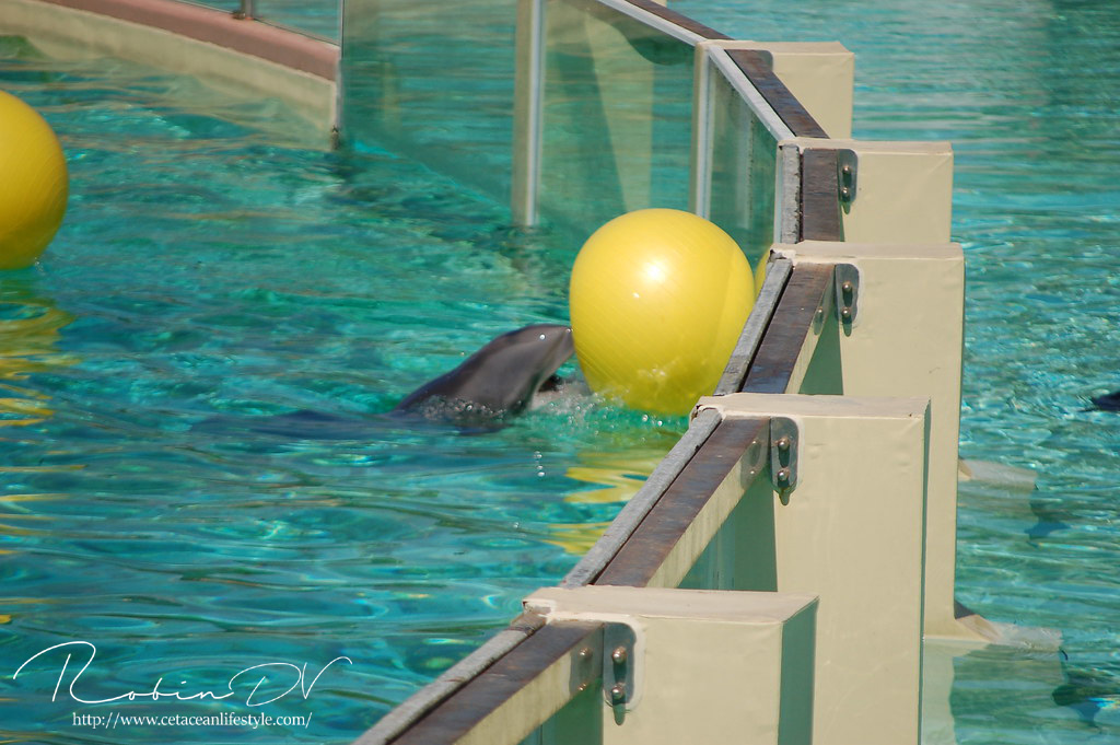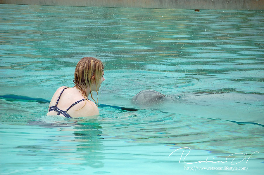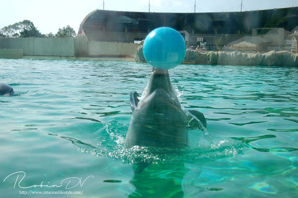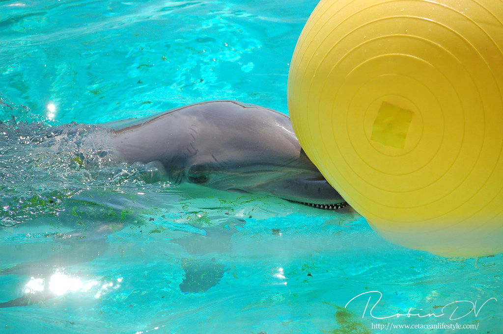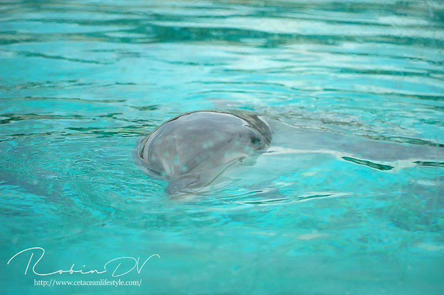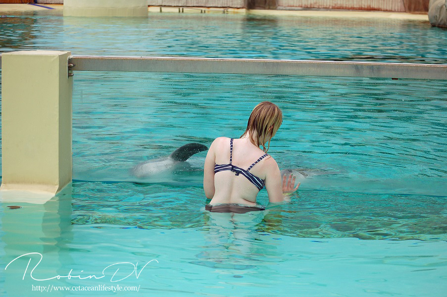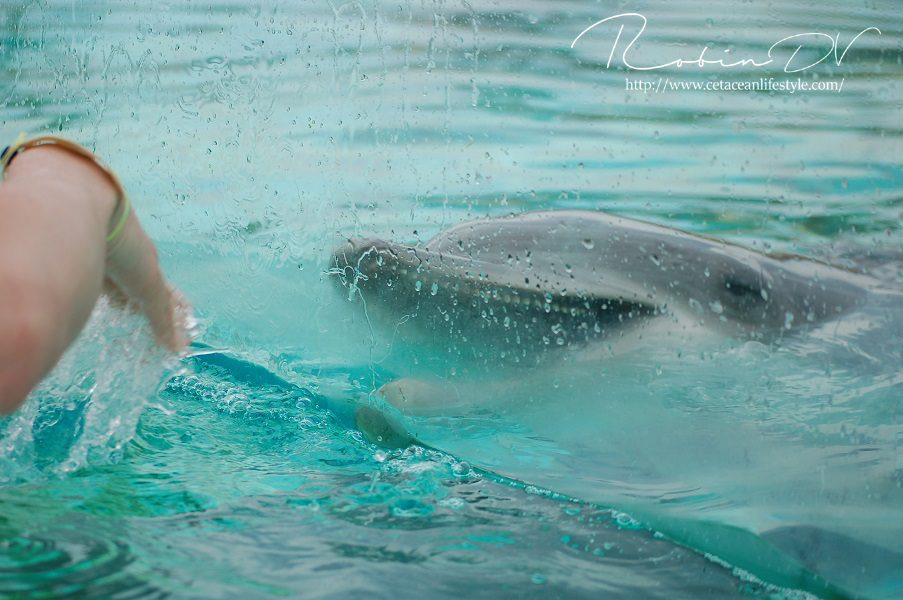 Het allergaafste was natuurlijk het zwemmen langs de dolfijnen! Je ziet ze, hoort ze en andersom ook. Omdat ik de eerste en enige was in het bassin waren ze ook ontzettend speels! Ze kwamen naar mij toe en speelden meerdere keren zo'n 10 á 15 minuten lang met me door het glas. Ook kwamen ze toen ze later ballen hadden, deze ballen brengen en begonnen ze deze over te gooien naar mij. Het is zo ongelofelijk leuk om 'vrij' contact te hebben met deze dieren! Zonder visbeloning, zonder ervoor te betalen zoals in een programma. Gewoon pure speelsheid en mooie momenten tussen jou en de dolfijnen. Ik moet hier wel bij vermelden dat toen het zwembad later in de week open ging en er veel meer mensen waren de dolfijnen niet steeds naar het glas kwamen om met iedereen te spelen. Ze zwommen toen gewoon langs het glas af (wat ook heel gaaf is!) er is dus geen garantie dat de dieren met je komen spelen. Als de dieren de hele dag mensen zien zullen ze uiteindelijk ook geen interesse meer hebben natuurlijk. Omdat ik op dat moment de enige was en waarschijnlijk de eerste in een lange tijd waren ze wellicht een stuk speelser dan normaal.