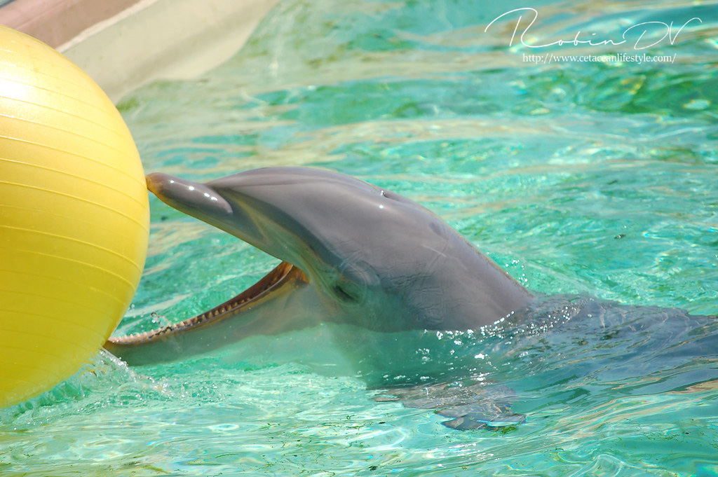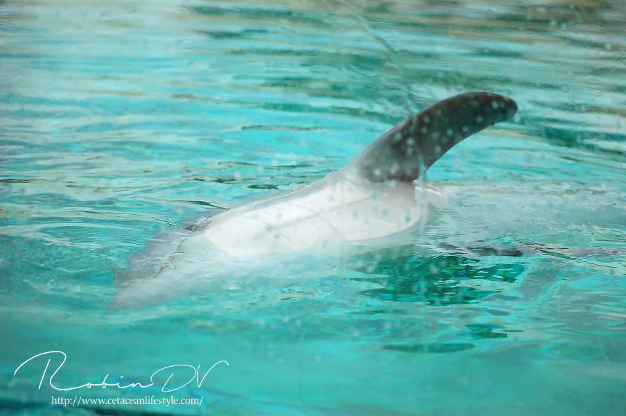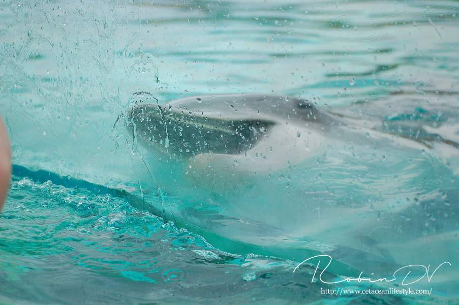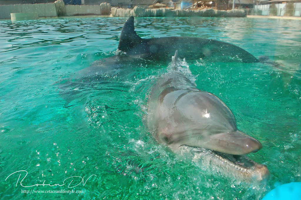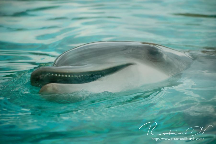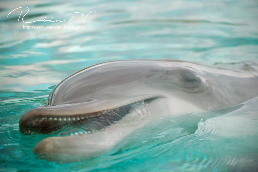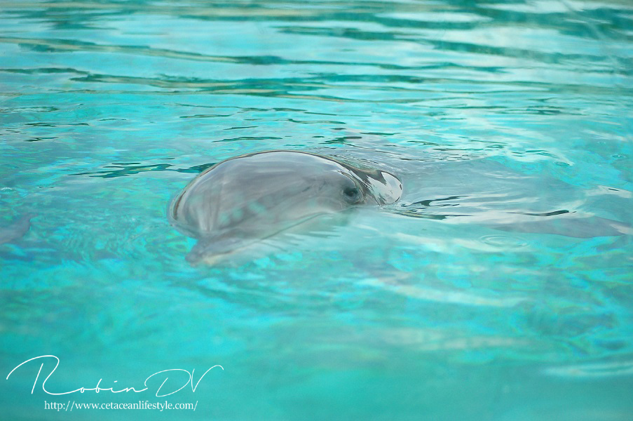 Het allergaafste was natuurlijk het zwemmen langs de dolfijnen! Je ziet ze, hoort ze en andersom ook. Omdat ik de eerste en enige was in het bassin waren ze ook ontzettend speels! Ze kwamen naar mij toe en speelden meerdere keren zo'n 10 á 15 minuten lang met me door het glas. Ook kwamen ze toen ze later ballen hadden, deze ballen brengen en begonnen ze deze over te gooien naar mij. Het is zo ongelofelijk leuk om 'vrij' contact te hebben met deze dieren! Zonder visbeloning, zonder ervoor te betalen zoals in een programma. Gewoon pure speelsheid en mooie momenten tussen jou en de dolfijnen. Ik moet hier wel bij vermelden dat toen het zwembad later in de week open ging en er veel meer mensen waren de dolfijnen niet steeds naar het glas kwamen om met iedereen te spelen. Ze zwommen toen gewoon langs het glas af (wat ook heel gaaf is!) er is dus geen garantie dat de dieren met je komen spelen. Als de dieren de hele dag mensen zien zullen ze uiteindelijk ook geen interesse meer hebben natuurlijk. Omdat ik op dat moment de enige was en waarschijnlijk de eerste in een lange tijd waren ze wellicht een stuk speelser dan normaal.
