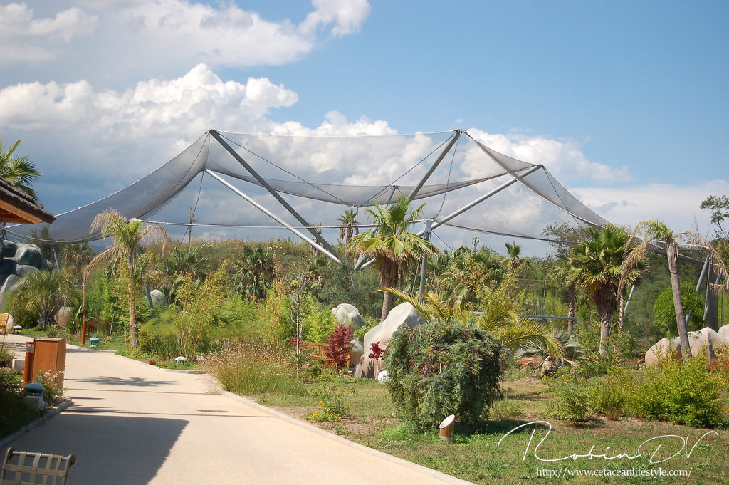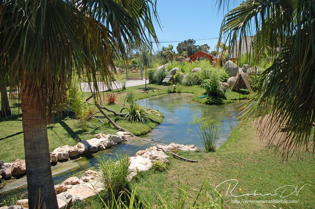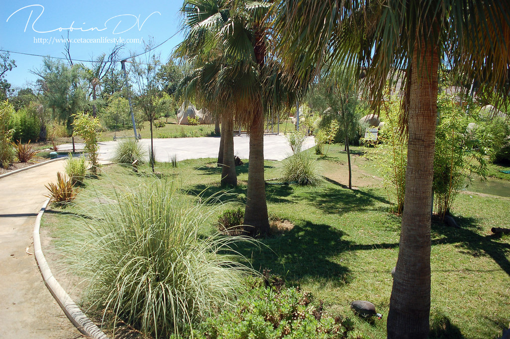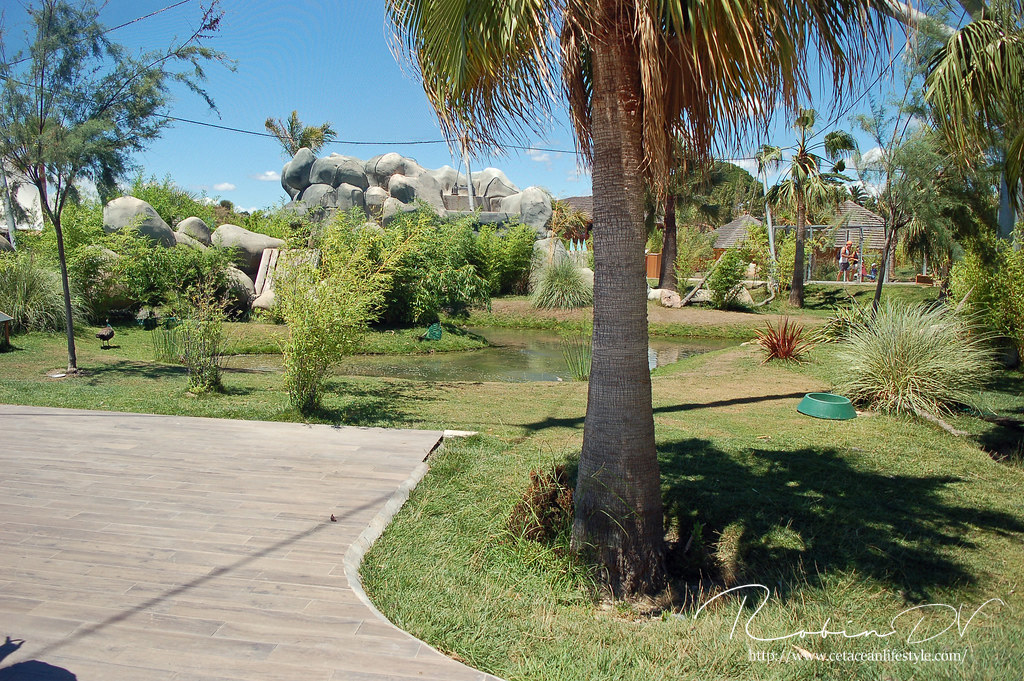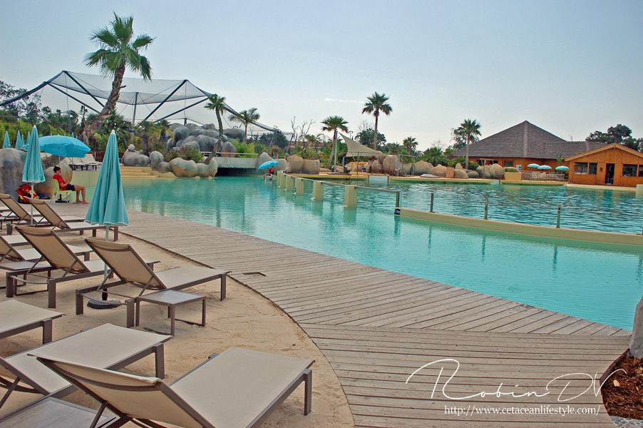 Je komt binnen door de poort, daar is vrijwel meteen een gebouw met de kassa's en een wachtruimte. Hier kun je entree kopen en informeren over de verschillende mogelijkheden. Ook de interactieve programma's zijn hier te boeken. Wanneer je je weg vervolgt heb je keuze uit een aantal ruime omkleedgebouwen met hokjes, Wc's en douches. Alles is schoon en netjes, maar alles is natuurlijk nog splinternieuw. Als je je weg vervolgt kun je kiezen voor de weg naar het zwembad, of een pad door de volière. Deze volière was eigenlijk bedoeld voor ringstaartmaki's, hier werd ook mee geadverteerd. Op het laatste moment zijn de maki's echter naar het zusterpark Kid's Island gegaan. Hierdoor staat de volière nu leeg op een paar pauwen na. Dit is erg zonde, want het is een zeer ruim en mooi beplant verblijf met paden, watervallen en bankjes. Wanneer je uit de volière komt stuit je op de ingang van het zwembad. Hier ligt een kunstmatig strandje waar veel luxe strandstoelen staan. Het bad zelf is ondiep, zodat iedereen naar het glas kan komen om de dolfijnen te zien. Het bad loopt uit in verschillende routes. Één route komt uit in de volière, wat ik erg origineel vond! De andere route gaat richting de zeeschildpadden en pijlstaartroggen. Ook deze kun je door het glas zien zwemmen! Er liggen drie bassins voor deze dieren achter in de Lagoon. Niet alles werd gebruikt toen ik er was. Het restaurant was open voor normale bezoekers en bied een buffet aan met warme, koude en verse producten. Je kunt met je bandje zoveel pakken als je wilt. Het gebied is mooi, schoon en netjes. Er is een duidelijk thema; alles heeft een "Hawaii-sausje".