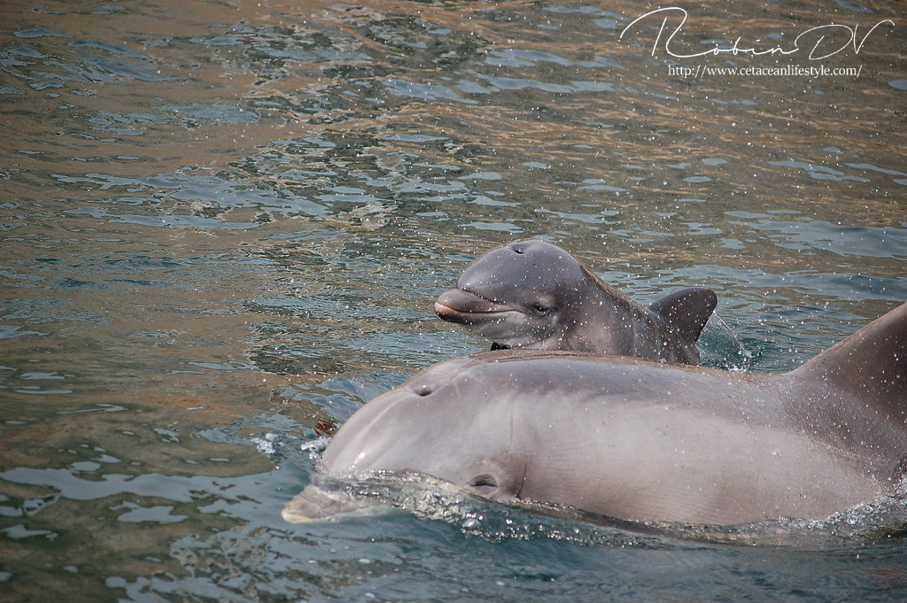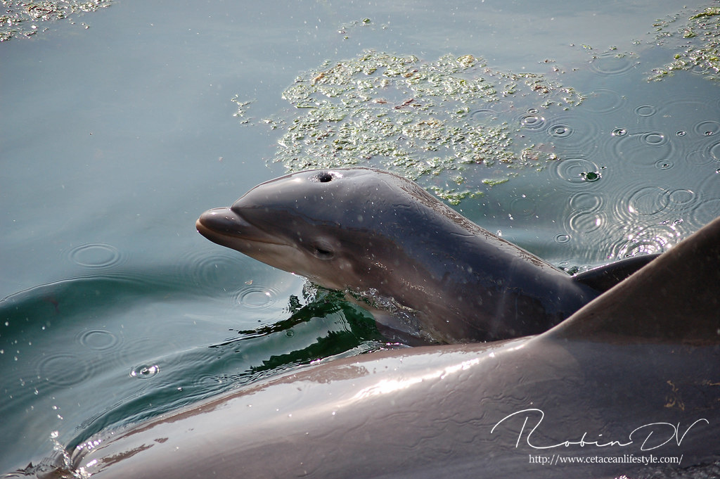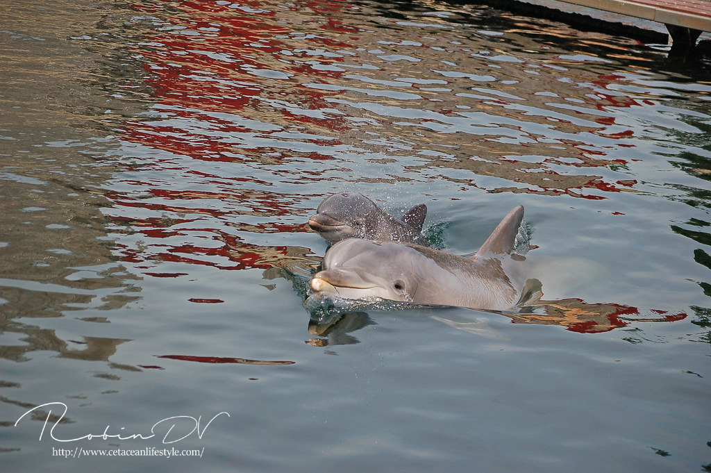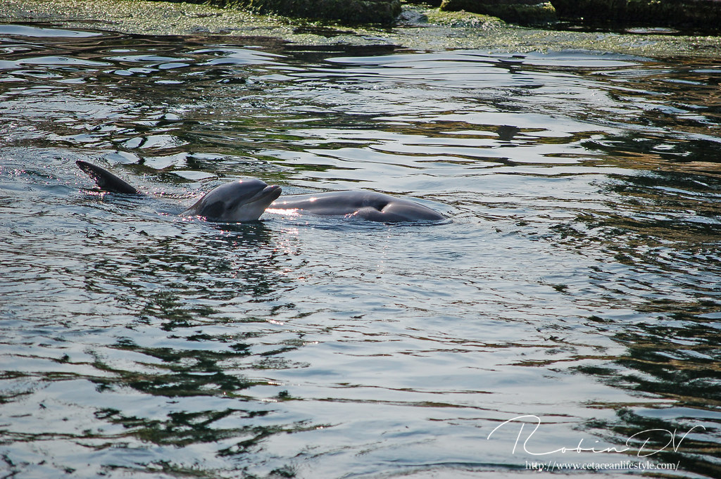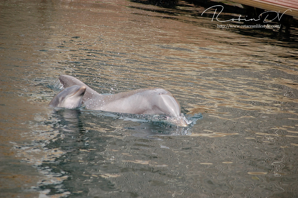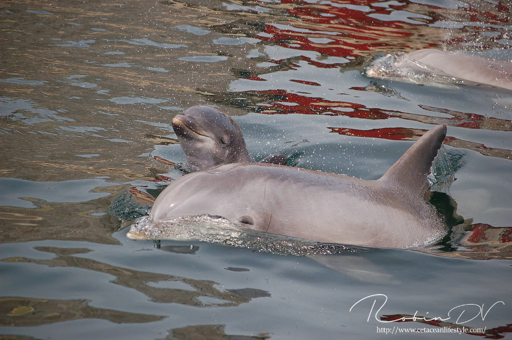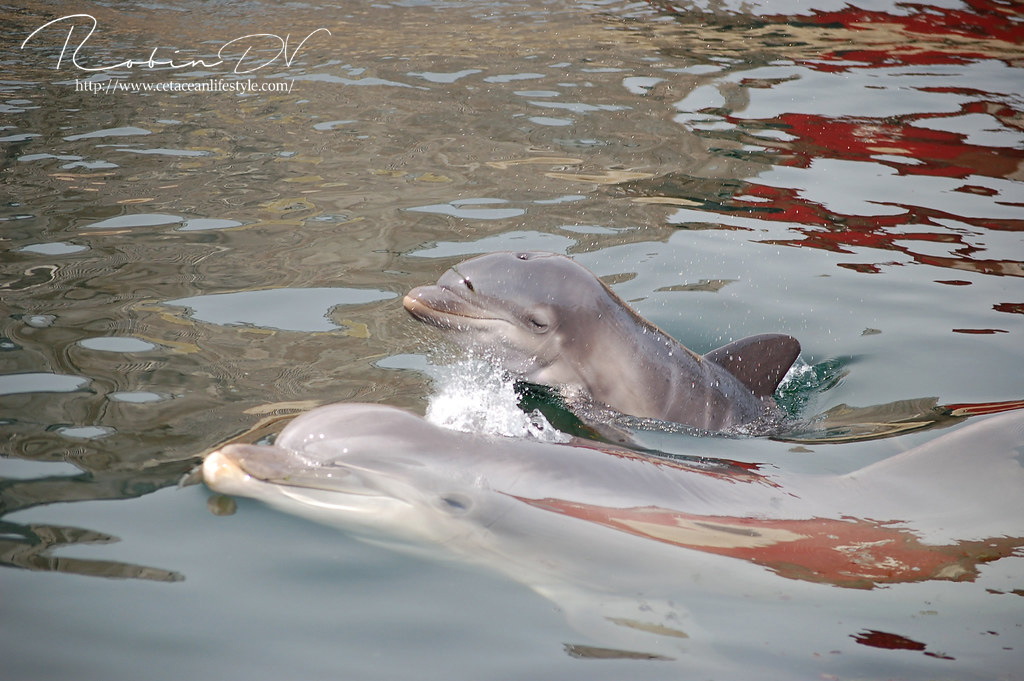 Jonge dolfijntjes komen ter wereld zonder immuunsysteem en hebben nog bijna geen spierweefsel of kracht om te zwemmen. Zij liften als het ware mee in de stroming die de moederdolfijn creëert tijdens het zwemmen. Dit wordt 'slipstreaming' genoemd. Door mee te zwemmen in de slipstream en zelf te bewegen met de staartvin bouwen de jongen zelf ook krachtige zwemspieren op. Aangezien jonge dolfijntjes zo kwetsbaar zijn tijdens de eerste periode na de geboorte is er een groot sterftepercentage. Meer dan de helft van de geboren dolfijnen zowel in het wild als in gevangenschap overleven de eerste weken niet. Dit is een behoorlijk groot verlies als je denkt hoe lang een dracht van een dolfijn eigenlijk duurt. Wanneer een moederdolfijn haar jong verliest is ze meteen weer vruchtbaar en krijgt ze vrijwel zeker precies een jaar later weer een jong. Wanneer het jong overleeft zal de moeder gemiddeld ongeveer pas na drie jaar weer drachtig worden. Hoewel men zich in dierenparken bewust is van de kwetsbaarheid van jonge dolfijntjes, is het erg moeilijk om hier zelf verbetering in te brengen, aangezien de jonge dolfijn zelf een immuunsysteem en kracht op moet brengen door het nuttigen van de melk en het zwemmen met het moederdier. Wel wordt alles zeer nauwkeurig gemonitord en ingegrepen wanneer dit nodig is. Naast James heeft Roxy nog drie zonen gekregen: Damsxi, Rocco en Storm. Ook heeft ze een dochter genaamd Parel. Een zeer ervaren moeder dus! Hier een aantal van mijn favoriete foto's van het stel: