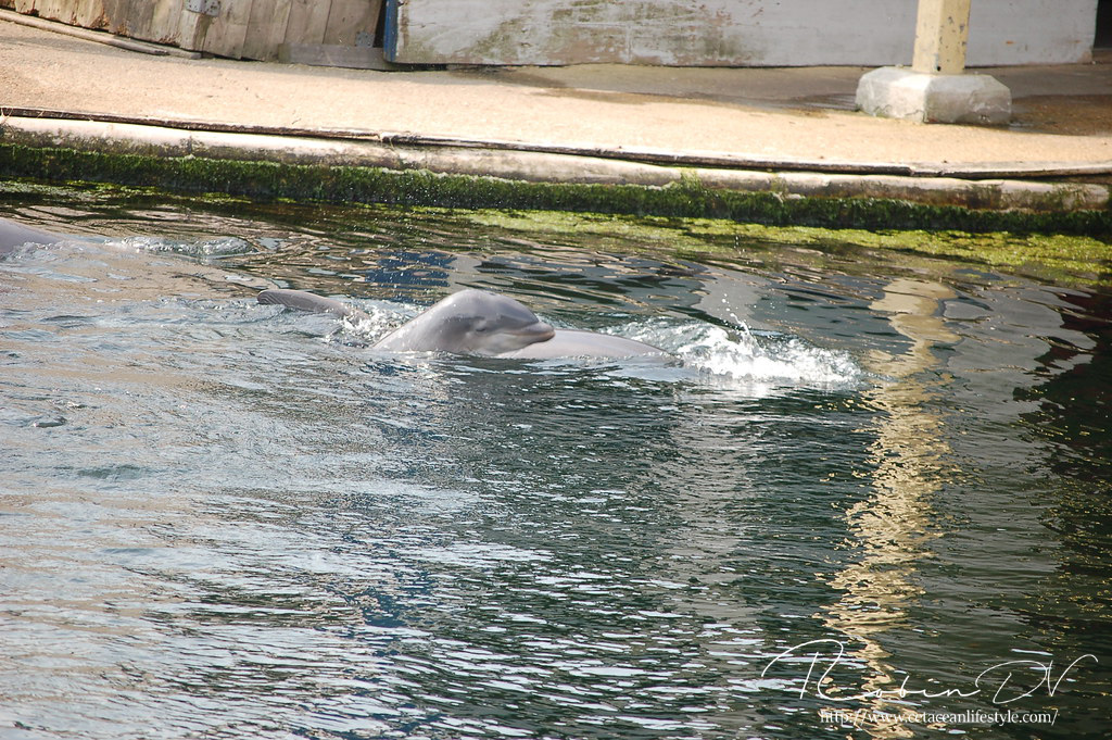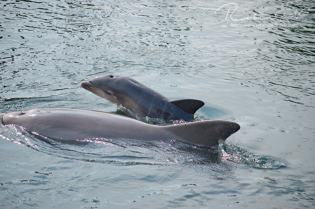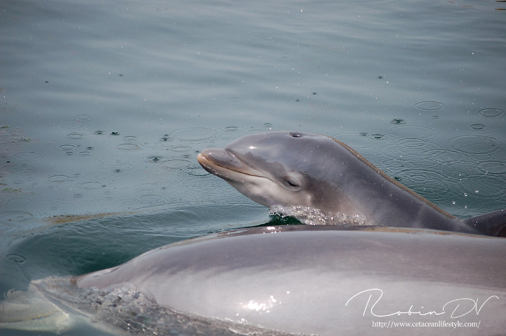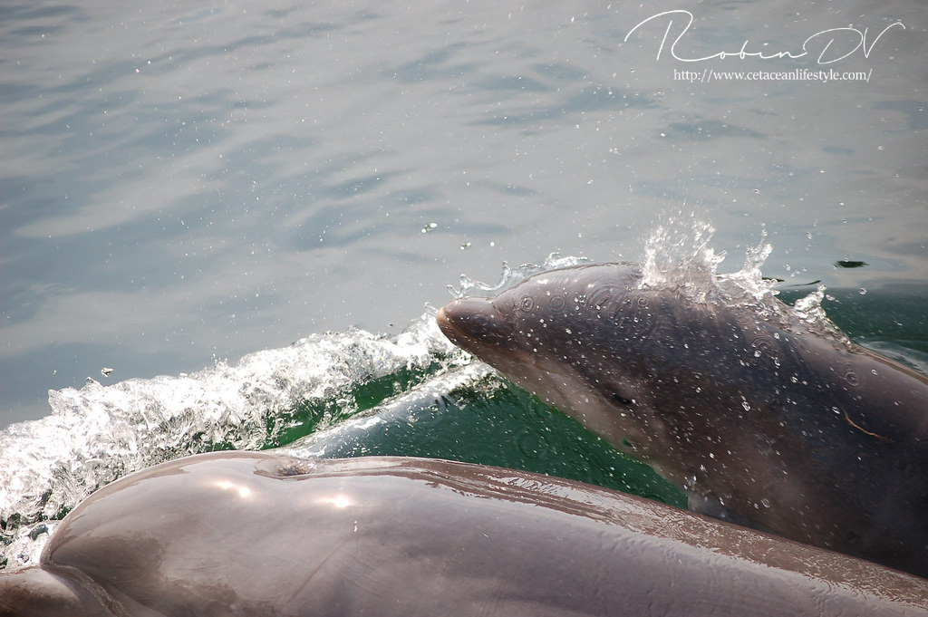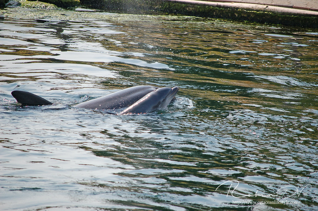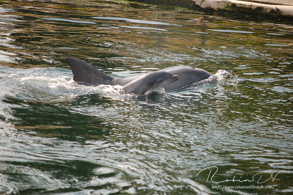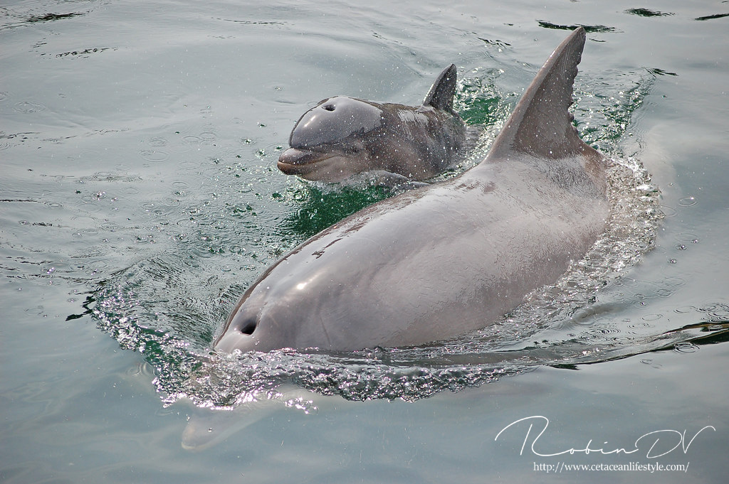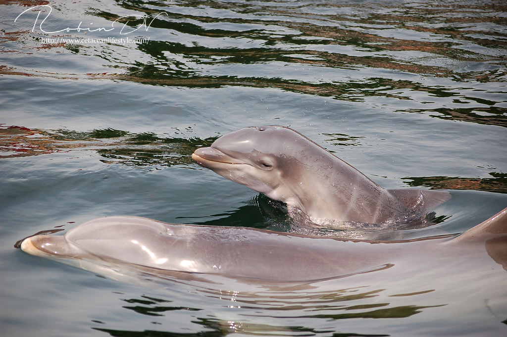 Jonge dolfijntjes komen ter wereld zonder immuunsysteem en hebben nog bijna geen spierweefsel of kracht om te zwemmen. Zij liften als het ware mee in de stroming die de moederdolfijn creëert tijdens het zwemmen. Dit wordt 'slipstreaming' genoemd. Door mee te zwemmen in de slipstream en zelf te bewegen met de staartvin bouwen de jongen zelf ook krachtige zwemspieren op. Aangezien jonge dolfijntjes zo kwetsbaar zijn tijdens de eerste periode na de geboorte is er een groot sterftepercentage. Meer dan de helft van de geboren dolfijnen zowel in het wild als in gevangenschap overleven de eerste weken niet. Dit is een behoorlijk groot verlies als je denkt hoe lang een dracht van een dolfijn eigenlijk duurt. Wanneer een moederdolfijn haar jong verliest is ze meteen weer vruchtbaar en krijgt ze vrijwel zeker precies een jaar later weer een jong. Wanneer het jong overleeft zal de moeder gemiddeld ongeveer pas na drie jaar weer drachtig worden. Hoewel men zich in dierenparken bewust is van de kwetsbaarheid van jonge dolfijntjes, is het erg moeilijk om hier zelf verbetering in te brengen, aangezien de jonge dolfijn zelf een immuunsysteem en kracht op moet brengen door het nuttigen van de melk en het zwemmen met het moederdier. Wel wordt alles zeer nauwkeurig gemonitord en ingegrepen wanneer dit nodig is. Naast James heeft Roxy nog drie zonen gekregen: Damsxi, Rocco en Storm. Ook heeft ze een dochter genaamd Parel. Een zeer ervaren moeder dus! Hier een aantal van mijn favoriete foto's van het stel:
