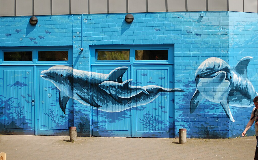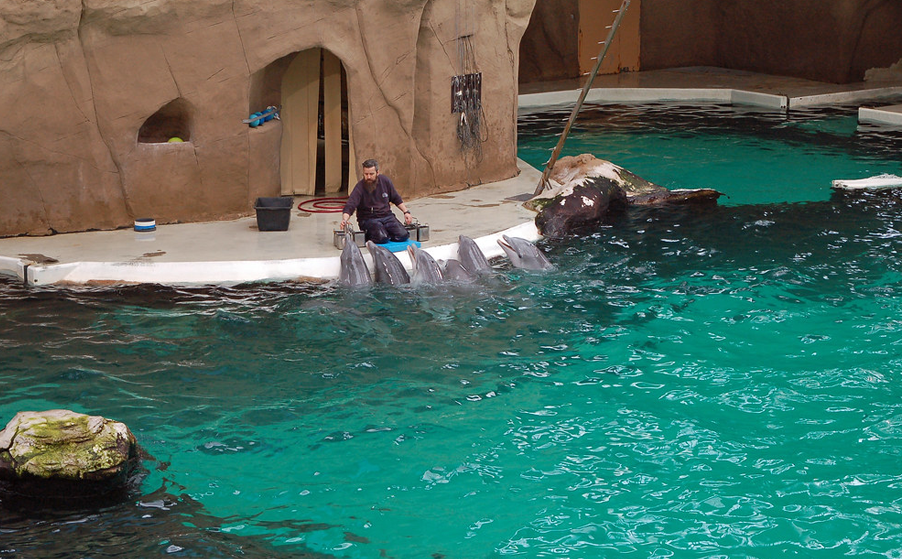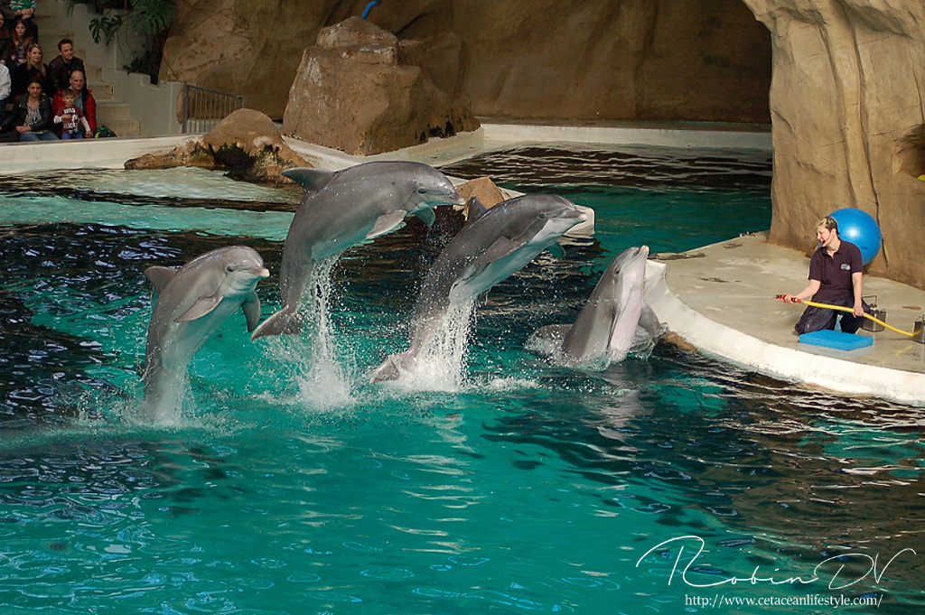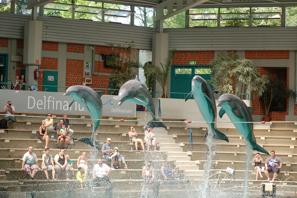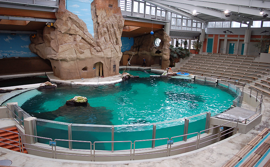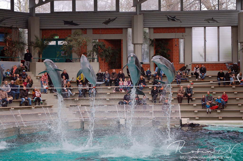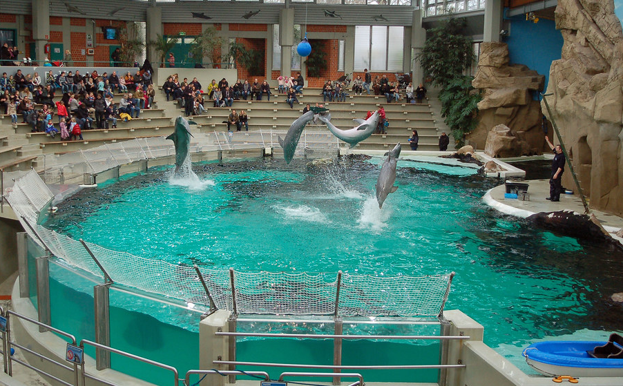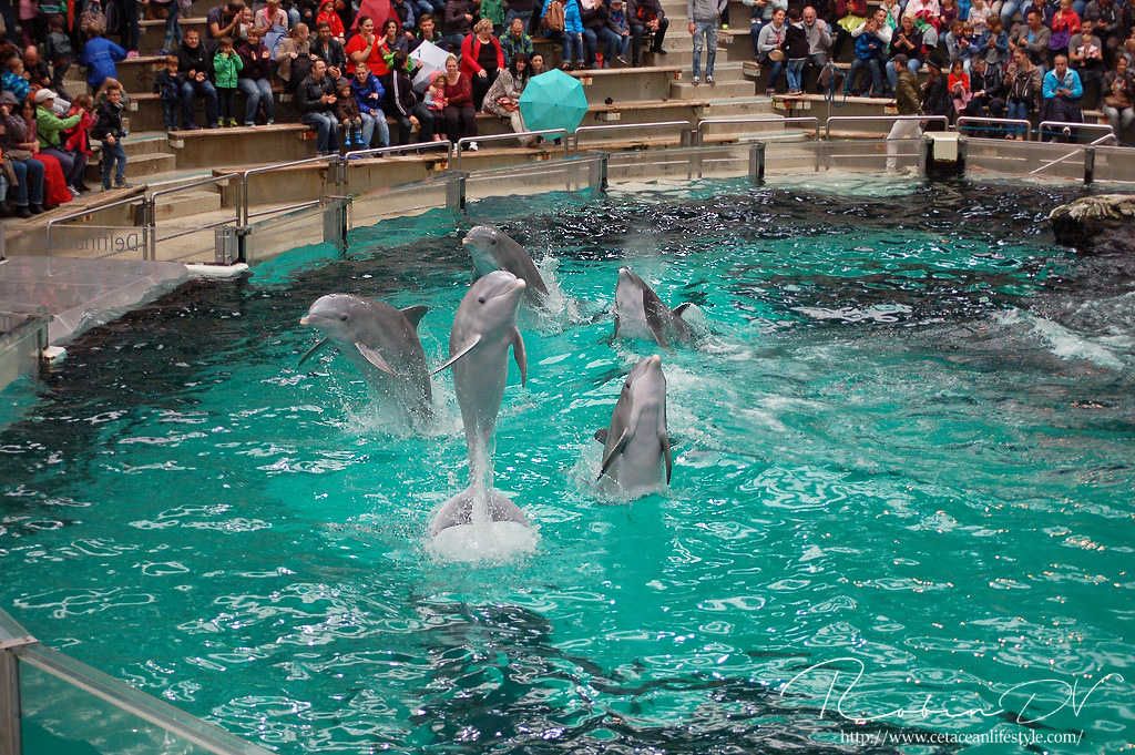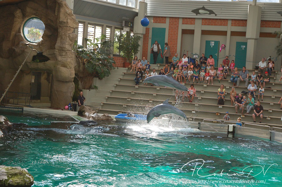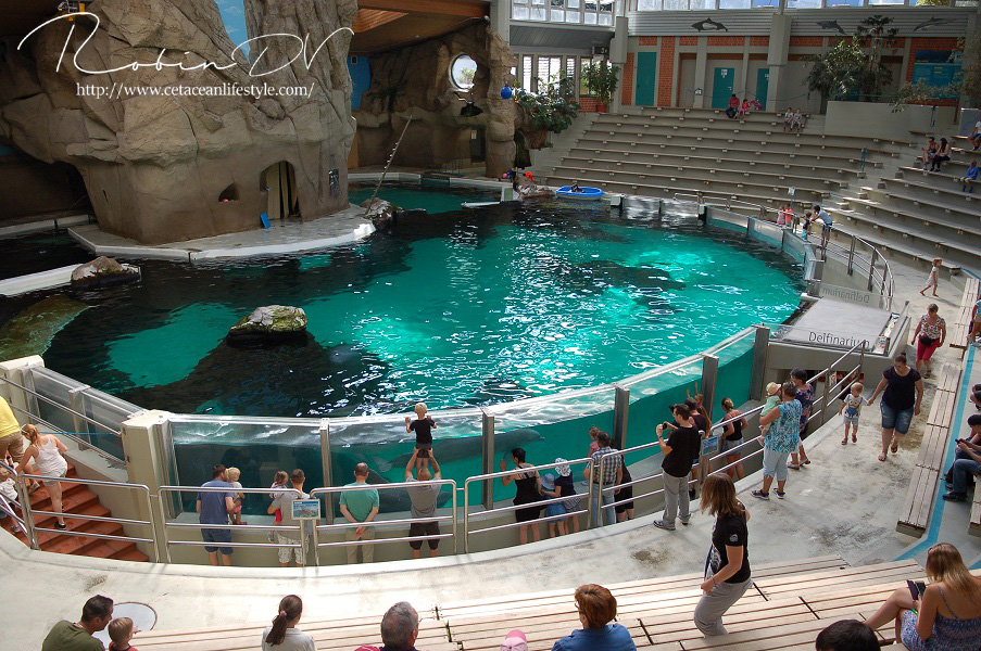 De absolute publiekstrekker is de dolfijnenshow. Deze is afhangend van het seizoen twee tot vier keer te zien per dag. Vroeger moest je apart betalen om deze show te kunnen zien. Je kon dan bij de kassa betalen of je je kaartje met of zonder dolfinarium wilde hebben. Dit is inmiddels al jaren niet meer zo. Alles is inbegrepen bij je kaartje en je kunt zelf bepalen of je naar de dolfijnenshow wil gaan of niet. Het dolfinariumgebouw is ook tussen de shows door open, je kunt dan echter alleen op de tribune komen. Vlak voor en na de show kun je wat verder naar beneden komen en de dieren van dichterbij bekijken. Kijk alsjeblieft uit, want de dolfijnen vinden het hilarisch om je zonder waarschuwing nat te gooien! Denk aan doorweekte kleren en kapotte mobieltjes en camera's! De dolfijnenshow is meer een presentatie. Een trainers spreekt door een microfoon en er gaat niemand in het water met de dolfijnen. Wel wordt er een kindje uit het publiek gehaald die in een bootje over het water mag varen. In de show wordt veel educatie en algemene feiten over dolfijnen besproken. De presentatie is echter alleen in het Duits. Spreek je geen Duits, ben dan niet bang! De dolfijnen laten continu prachtige sprongen en mooie/leuke gedragingen zien. Het is dus sowieso leuk om naar te kijken!