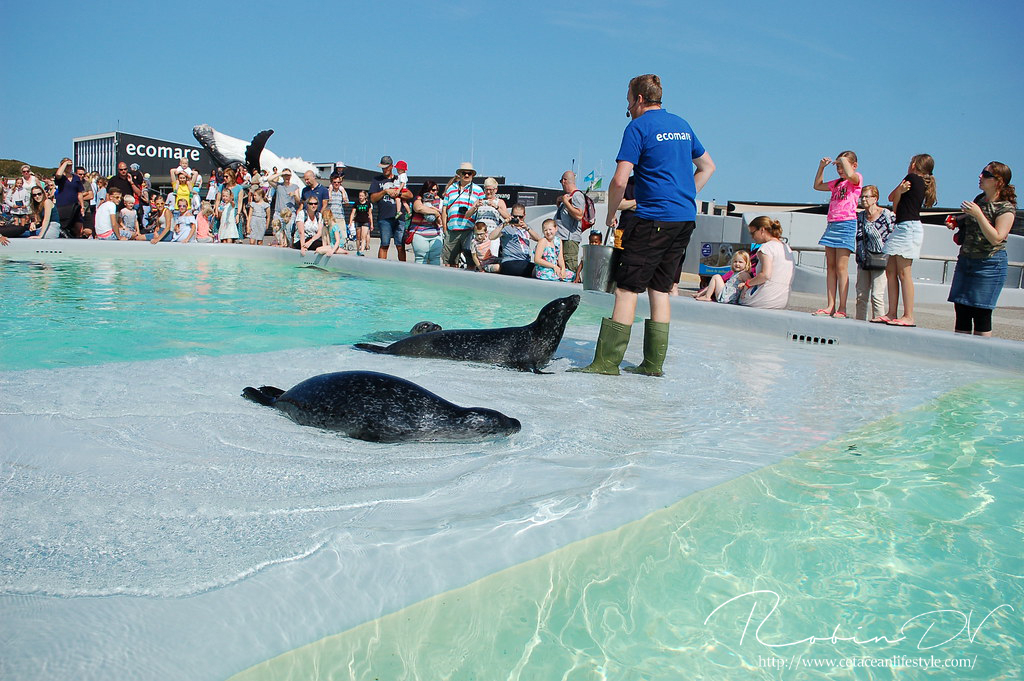 Bij Ecomare kun je drie verschillende vinpotigen bekijken. De Gewone Zeehond, de Grijze zeehond en de Ringelrob. Die laatste is best wel speciaal! Deze dieren komen oorspronkelijk uit Burger's Zoo en er is maar één ander park in Europa dat deze dieren houdt. Wat zo speciaal is aan Ecomare is hoe dichtbij je kunt komen. Je kunt op enkele centimeters afstand zijn van een zeehond of een bruinvis. De zeehonden kunnen zelfs hun bassins verlaten als ze willen. Dit schijnen ze ook regelmatig te doen als het park gesloten is om bij elkaar op bezoek te gaan! De bruinvissen zijn voor mij de absolute favoriet. Ook deze dieren kom je niet veel tegen in dierenparken terwijl ze zo leuk en speciaal zijn. In Ecomare leven twee mannetjes: Dennis en Michael. Beide dieren zijn op jonge leeftijd gestrand en opgevangen door SOS Dolfijn op hun toenmalige locatie in het Dolfinarium in Harderwijk. Zowel Michael als Dennis hebben kort in Harderwijk geleefd voor ze naar Ecomare kwamen. Hier leven ze nu in permanente opvang. Michael is het oudste dier, hij is makkelijk herkenbaar aan zijn donkere hoofd en rug. Dennis is de lichtste en stevigste van de twee. Dennis is een stuk speelser dan Michael. Naast de zeezoogdieren zijn er ook verschillende soorten zeevogels te zien zoals meeuwen, jan van genten en aalscholvers. De meeste dieren zijn opvangdieren of dieren die permanent een plekje hebben gevonden in Ecomare. In het aquariumgedeelte zijn ook nog veel verschillende Noordzeedieren te vinden. Sommige mag je zelfs aanraken. Ik blijf erbij dat Noordzee aquaria ontzettend leuk en leerzaam zijn omdat we er 'onze' eigen dieren in kunnen zien zwemmen.