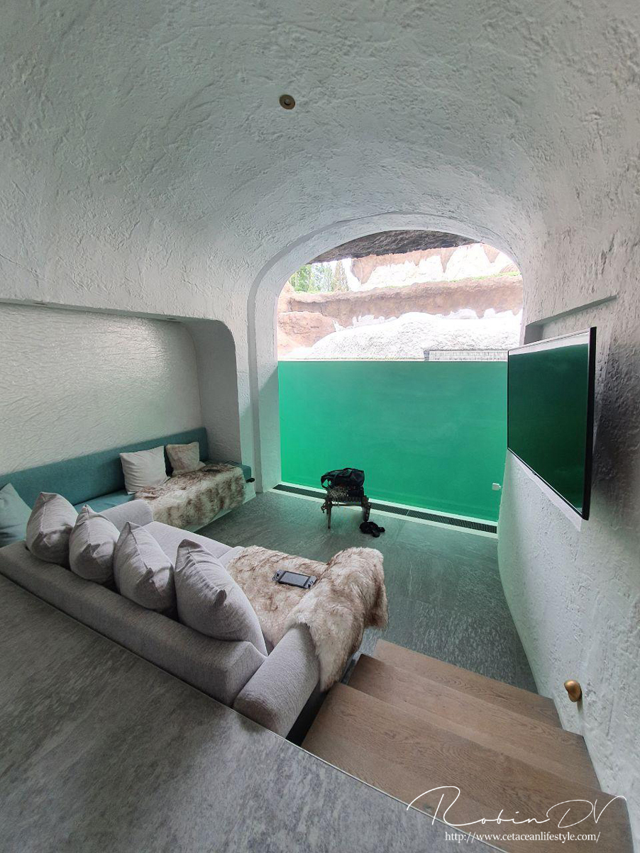 - Overdag hoor je in de hotelkamer de bezoekers heel goed. De walruskamers liggen namelijk midden in het themagebied. Je loopt letterlijk van de bezoekersroute (die van de mijnen naar de ijsgrot gaat) je kamer in. (Het is best wel grappig als je mensen dan verbaasd ziet kijken dat je een hotelkamer opent midden in de dierentuin). Ook liggen de walruskamers recht boven de onderwatertunnel waar het publiek staat.