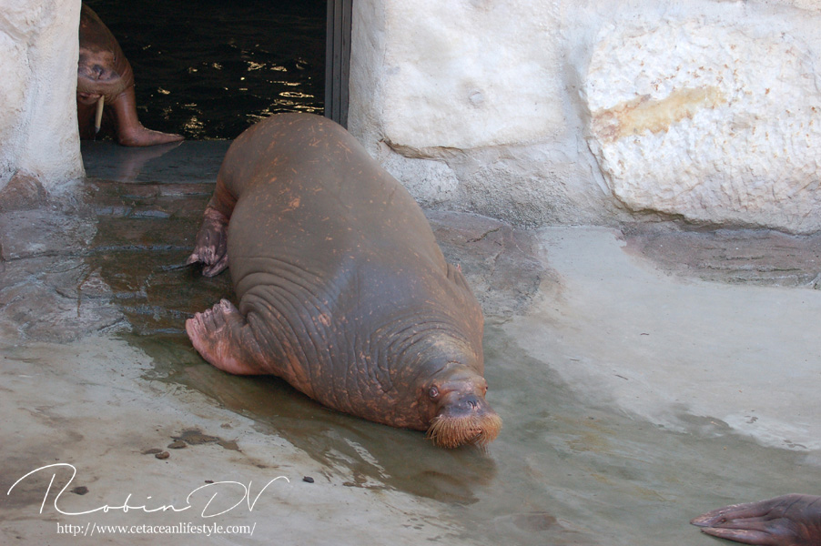 Dan zal ik maar beginnen met de meest herkenbare walrus van Pairi Daiza; Garik. Garik oftewel Svyatogor, is een mannelijke walrus van ongeveer 9 jaar oud. Zijn meest herkenbare uiterlijke kenmerk zijn de twee korte, rechte slagtanden. Garik is de enige walrus met zichtbare slagtanden in Pairi Daiza en dus het makkelijkste te herkennen. Verder is hij een middelgroot, jong mannetje met een oranje-bruine vacht en roze flippers. Ook op zijn snuit en gezicht is hij wat lichter roze gekleurd. Inmiddels zijn de slagtanden ook voorzien van ijzeren kapjes. Dit is om te voorkomen dat de tanden beschadigd raken of zelfs splijten. Dit zie je ook wel eens bij olifanten in gevangenschap. Bij de meeste walrussen in gevangenschap worden de slagtanden preventief verwijderd om breuken en ontstekingen te voorkomen. Dit is namelijk iets wat vaker voorkomt bij walrussen en fataal kan zijn. Garik kwam echter uit Rusland met zijn slagtanden nog intact. Hij is daar geboren in het wild en werd in 2012 gevangen samen met meerdere walrussen uit dezelfde groep, waaronder Frosya. Daar leefde hij eerst in het dolfinarium van Sint Petersberg en daarna in Utrish Marine Station. Op 13 juni 2021 verhuisde hij samen met Frosya naar Pairi Daiza. Er is kritiek op Pairi Daiza voor het verkrijgen van dieren die oorspronkelijk uit het wild kwamen, maar ook de dieren van L'Oceanografic en Zoo Hagenbeck komen uit wilde populaties. Naast Garik leven er nog twee andere mannetjes in Pairi Daiza. Dit zijn Thor en de kleine Floki. Vooral Thor stoeit heel veel met Garik, zelfs door de hekken heen als ze gescheiden zitten. Dit is vrij typisch gedrag onder jonge mannetjes en kan er soms ook erg ruig aan toe gaan. Door zijn karakteristieke slagtanden is Garik erg herkenbaar en daarom ook een grote publiekslieveling.