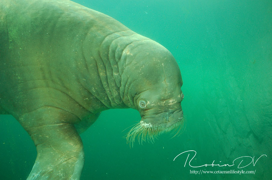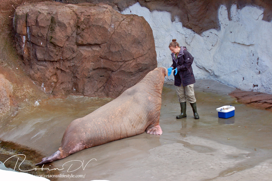 Boven: Floki is de enige baby walrus in het verblijf en duidelijk veel kleiner dan de rest. Al groeit hij echt ontzettend snel!