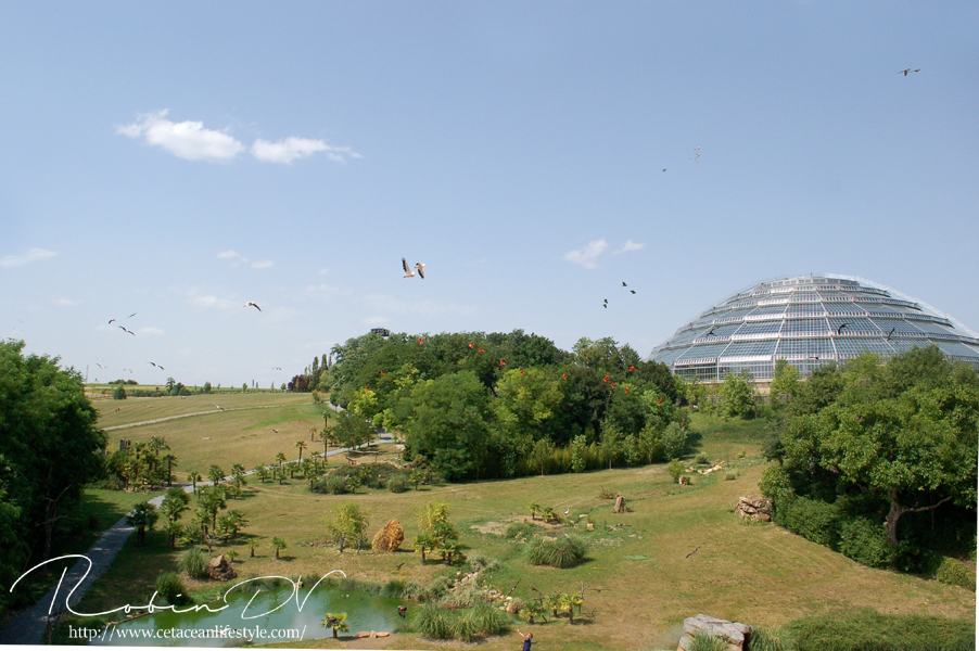 Boven: Een overzicht van ZooParc de Beauval, waaronder de bekroonde vogelshow "Les Maîtres des Airs" (de Meesters van de Lucht) met de Dôme Equatorial op de achtergrond. De twee hoogtepunten van mijn bezoek.