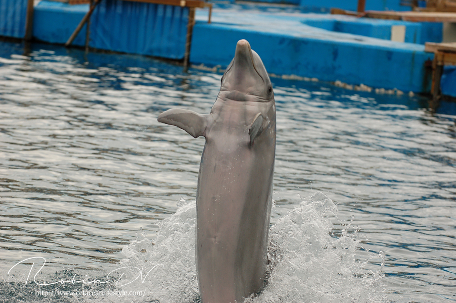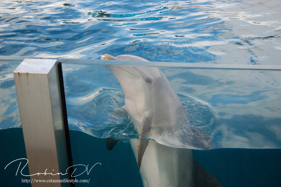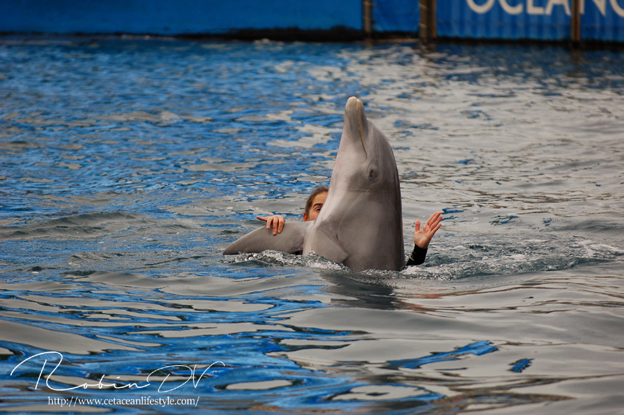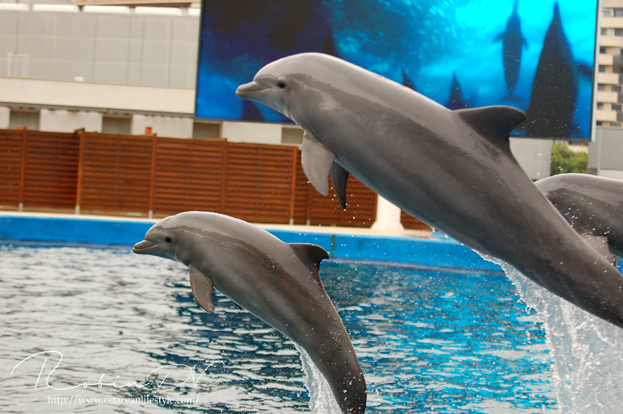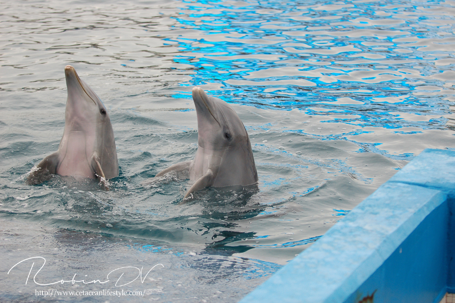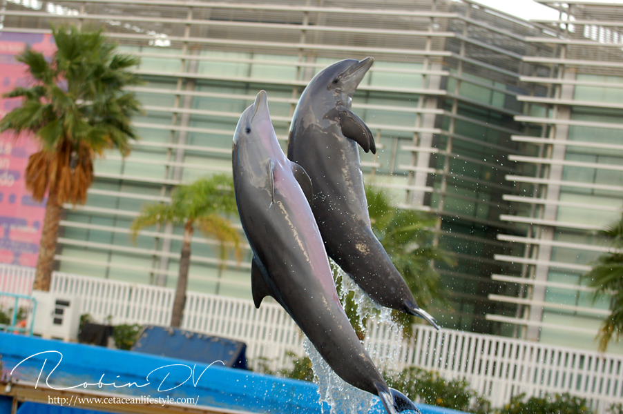 Boven: De dolfijnen zwemmen vrij rond buiten de shows om, ieder dagdeel zwemt er een andere groep dieren in het grote bassin. De dolfijnen zijn erg interactief naar bezoekers toe, vooral door de glaswand. Op de foto's zie je: Pfizer, Grisel, Virkin, Kai, Ura, Lazo, Josúe, Neptuno, Billy en Baily. Op de showfoto's zijn ook nog Aya, Nika en Elly te zien.