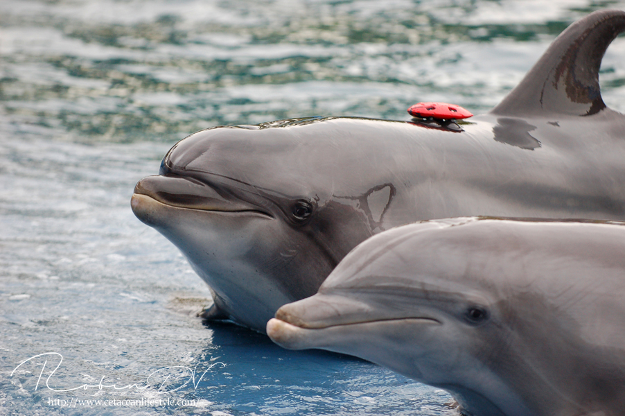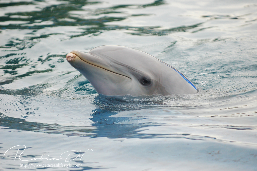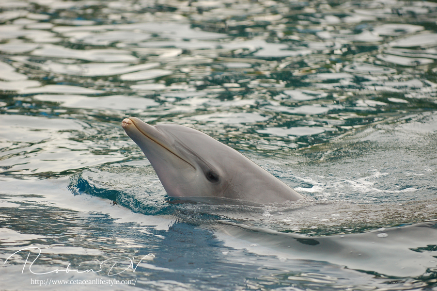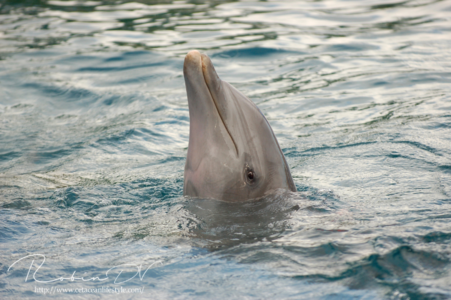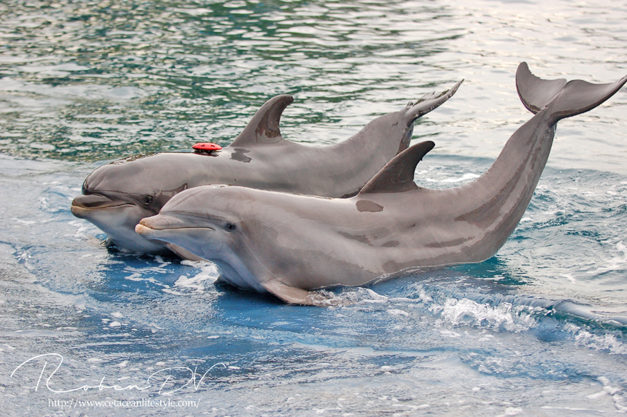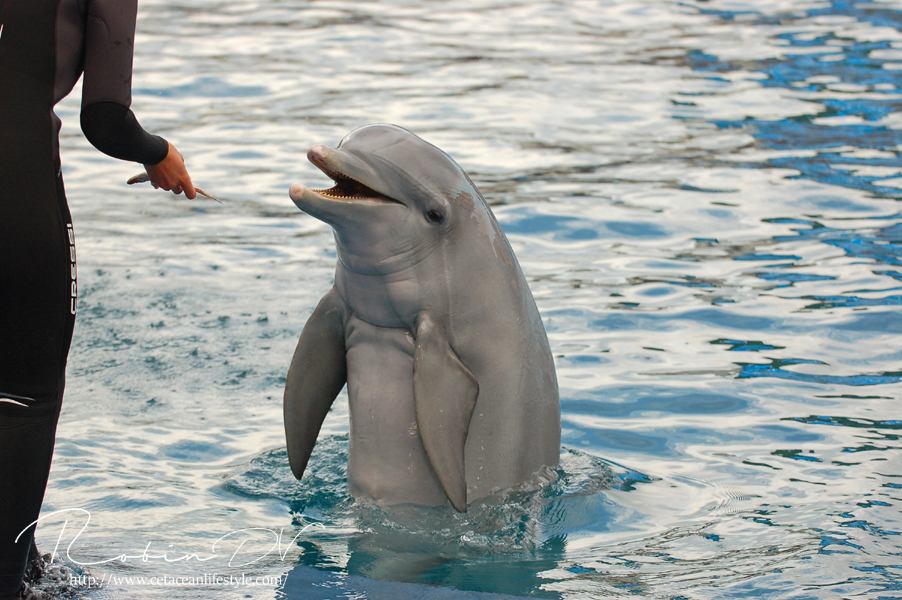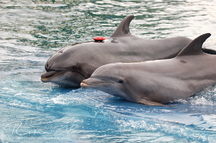 Boven: De dolfijnen zwemmen vrij rond buiten de shows om, ieder dagdeel zwemt er een andere groep dieren in het grote bassin. De dolfijnen zijn erg interactief naar bezoekers toe, vooral door de glaswand. Op de foto's zie je: Pfizer, Grisel, Virkin, Kai, Ura, Lazo, Josúe, Neptuno, Billy en Baily. Op de showfoto's zijn ook nog Aya, Nika en Elly te zien.