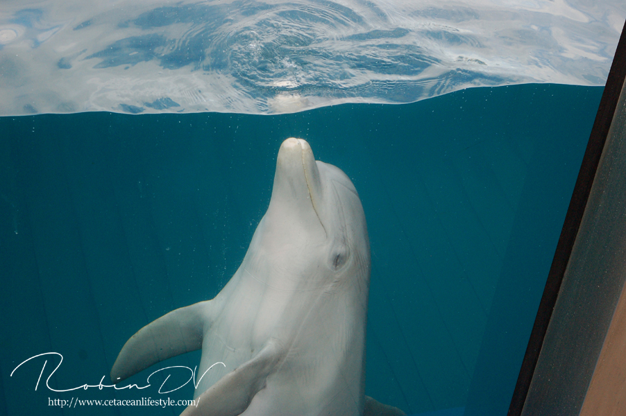 Dan is er ook nog Nika, een aparte verschijning. Vrijwel alle tuimelaars in Europese dolfinaria, aquaria en dierentuinen zijn Atlantische tuimelaars, op enkele uitzonderingen na. Dit zijn de zogenoemde 'Flipper' dolfijnen. Iedereen kent ze wel; Groot, lichtgrijs met een lichtere tot witte buik, atletisch en slank gebouwd met een lange snuit. Er zijn echter ook ondersoorten van de tuimelaar, die er naarmate ze zich aangepast hebben aan hun leefomgeving iets anders uit zijn gaan zien. Soms zijn die verschillen miniem en moet je een kenner zijn om ze te zien, soms zijn ze heel erg duidelijk. Zo heb je bijvoorbeeld de Stille Oceaan Tuimelaar, (Tursiops truncatus gillii) dit dier is over het algemeen wat zwaarder, vaak wat donkerder van kleur en heeft een iets andere kopvorm. Een nog extremere versie daarvan is de Buitenkust Tuimelaar, (Tursiops nuaanu) die bijna zwart van kleur is, een platte korte snuit heeft en veel lomper van vorm is. Dan heb je nog de andere kant van het spectrum zoals de Langbektuimelaar, (Tursiops aduncus), die juist wat langer en dunner van vorm lijkt, een veel langere duidelijke snuit heeft en qua kleuren ook wat afwijkt. Zij hebben vaak vlekjes op de keel en buik en zeer donkere randen om de ogen. Zo zijn er allemaal verschillen te zien tussen de verschillende ondersoorten. Google maar eens op deze soorten en kijk of je de verschillen kunt ontdekken. Uiteindelijk kun je doormiddel van een foto van een dolfijn vrij accuraat bepalen welk type het is. Zelfs wanneer het nog geen officiële ondersoort is, kun je vaak zien aan het uiterlijk waar een dolfijn vandaan komt. Dit zie ik bijvoorbeeld heel duidelijk bij dieren die uit Cuba komen of rond Schotland. In het geval van Nika; zij is een Zwarte Zee Tuimelaar (Tursiops ponticus). Dit is dus een geïsoleerde groep die alleen voorkomt in de Zwarte Zee. Qua uiterlijk zie je zeker verschillen. Kijk maar eens naar de foto's waarbij ze langs Lazo op het platform ligt. Over het algemeen zijn Zwarte Zee Tuimelaars wat donkerder, korter en gedrongener van bouw en zijn de snuit en kop-aftekeningen vrij dik en karakteristiek. De witte vlek die je op de foto's ziet is geen deel van deze kenmerken, maar een litteken. Wanneer een verwonding heelt bij dolfijnen blijft de huid op die plek vaak voor altijd wit. Een voorbeeld hiervan was dolfijn Skinny uit het Dolfinarium in Harderwijk.