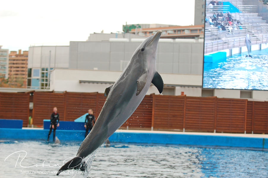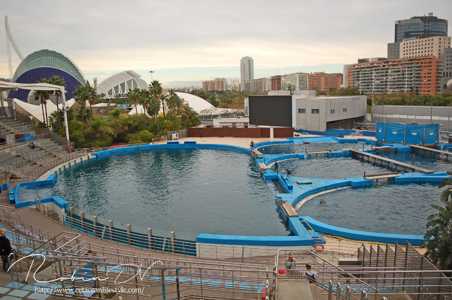 Het dolfinarium van Oceanogràfic is een enorm complex. Het heeft de vorm van een klassiek dolfinariumbassin: een grote "showpool" aan de voorkant, die met name wordt gebruikt voor voorstellingen en verschillende separatiebassins. Een vrij standaard set-up in de dolfinariumwereld. Toch is dit bassin vele male groter dan alle andere bassins van dit type die ik heb gezien. Dit komt misschien niet helemaal over op de foto, maar het viel echt op hoe groot dit gebied was. De dieren leven hier in 24 miljoen liter water! Even ter vergelijking: De hele leefruimte van de dolfijnen in de dolfijnendelta van het Dolfinarium Harderwijk is 13 miljoen liter! Dit complex is vrij te bezoeken, ook tussen de voorstellingen door. De dieren zitten gegroepeerd in de verschillende bassins. Bij mijn bezoeken zat er iedere keer een andere groepering in het grote bassin, er werd dus actief gewisseld. Er leven 19 tuimelaars in het dolfinarium van Oceanogràfic en je kunt alle bassins ten alle tijde zien, maar op geen moment was het mogelijk alle dieren tegelijk te spotten, wat ook weer de omvang weergeeft van de leefruimte. Op de achtergrond van het complex zag je flatgebouwen en andere delen van de stad, dit vond ik zelf een beetje jammer/storend. Je komt dit eigenlijk door heel het park tegen, maar om één of andere reden viel het me in de rest van het park minder op of was het minder aanwezig. De voorkant van het complex is voorzien van een zogenaamde "slide-out" waarop de dieren uit het water kunnen komen en een lange glaswand. Hierdoor zijn de dieren nog beter te bekijken. De dieren zwommen ook actief langs deze glaswand en hadden interacties met de bezoekers.