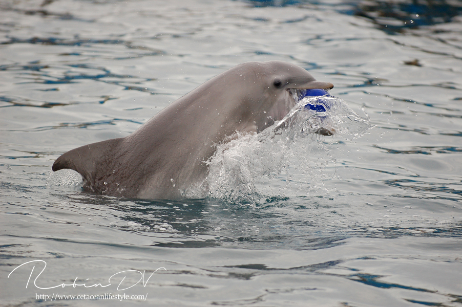 Je hebt hem waarschijnlijk al langs zien komen op mijn foto's, de D-Tag. Dit rode apparaatje kan doormiddel van zuignappen bevestigd worden op de rug van een dolfijn. Dit is een apparaat dat daadwerkelijk gebruikt wordt door Oceanogràfic in studies naar wilde dolfijnen! Deze D-Tag meet verschillende parameters zoals watertemperatuur, snelheid, diepte van een duik, de activiteit van de dieren en het neemt ook geluid op. De dolfijnen in het dolfinarium van Oceanogràfic hebben bijgedragen aan de ontwikkeling van dit nuttige onderzoeksmiddel, het kon namelijk op hen worden getest. In iedere show is een segment waarop dit nog een keer wordt gedemonstreerd aan het publiek. Op mijn foto's zie je het op de rug van Nika en Josué zitten, zelfs tijdens duiken, snelzwemmen en sprongen blijft de D-Tag prima op zijn plek zitten. Dit was naar mijn mening echt een leuke en interessante toevoeging dat ook aan het publiek laat zien hoe nuttig het kan zijn om onderzoek te doen en ontwikkelen op dolfijnen onder menselijke zorg.