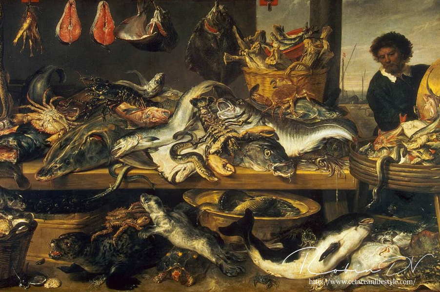 Boven: De orka was een zeldzame trofee die weinig mensen ooit in het echt hadden gezien zoals de tekening bewijst, die overduidelijk op basis van beschrijving van een orka is gemaakt, maar de artiest heeft het dier nooit in levende lijve gezien. Zeezoogdieren werden regelmatig gegeten zoals op de bovenstaande schilderijen te zien is, waar bruinvissen en zeehonden deel uit maken van het zeebanket.