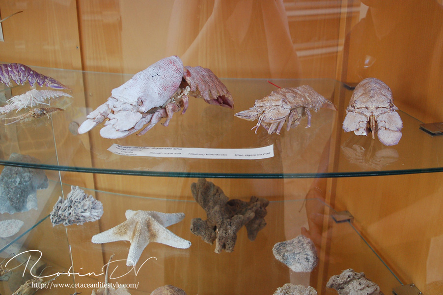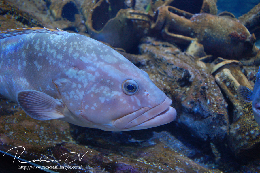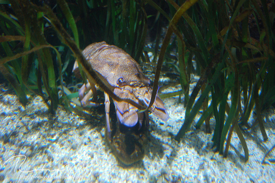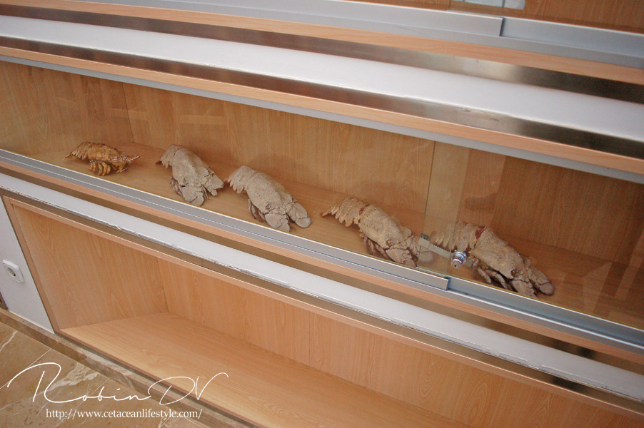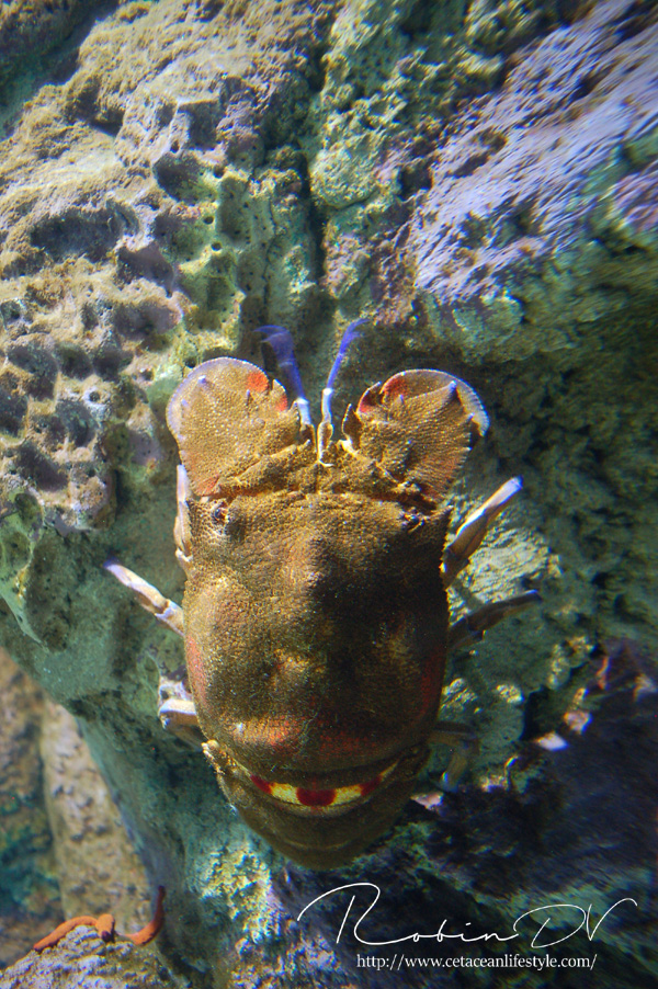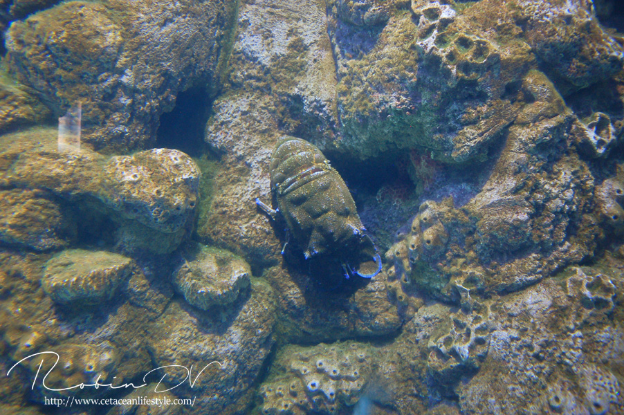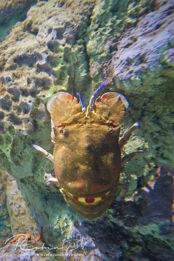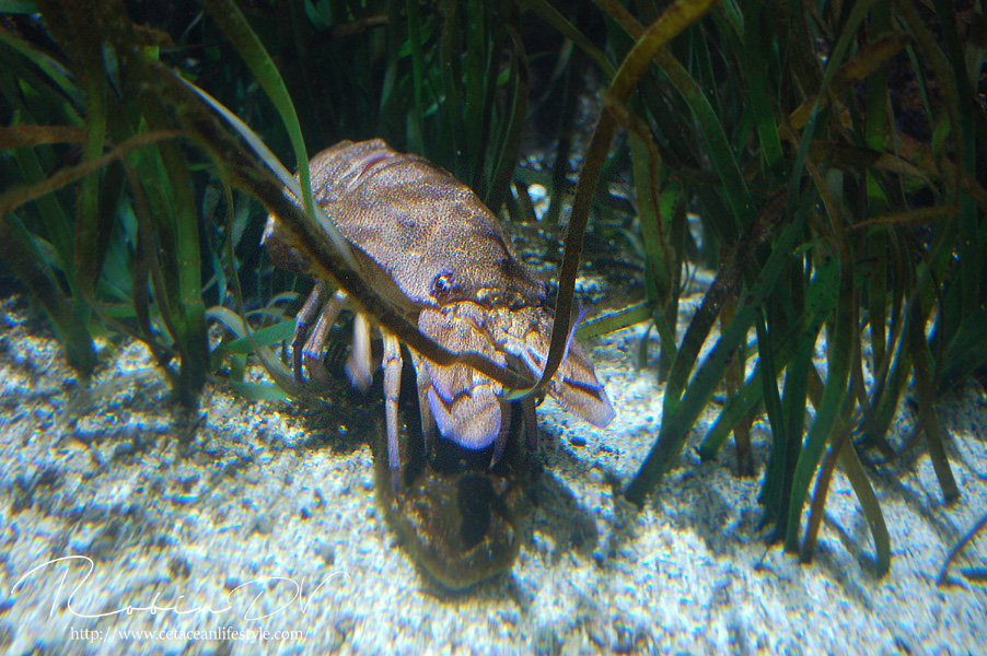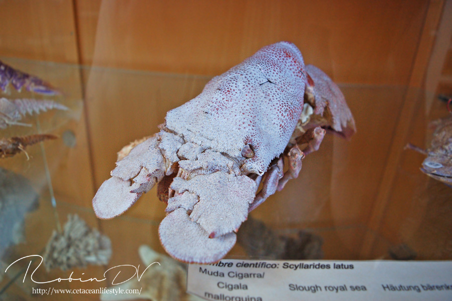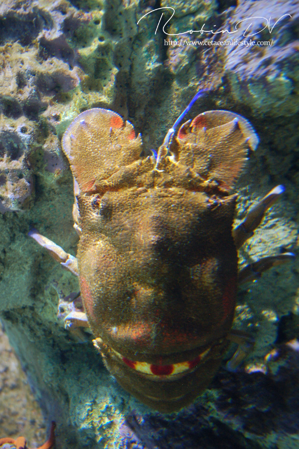 Een dier wat erg centraal stond in de collectie is de Mediterraanse beerkreeft (Scyllarides latus). Dit is een zeer apart uitziend schaaldier, wat inderdaad enigszins lijkt op een kreeft. Al hebben ze geen stekels en scharen zoals de klassieke kreeften dat hebben. In plaats daarvan hebben ze platte, brede uitsteeksels die ze gebruiken om te graven. Beerkreeften kwamen over de gehele Middellandse Zee voor, maar zijn door overbevissing erg zeldzaam geworden. Ze zijn namelijk culinair gezien erg gewild en daardoor ooit bijna verdwenen uit het gebied. Ze worden zo'n 30 cm groot, in zeldzame gevallen 40 cm. Over hun gedrag, voortplanting en hoe de jongen eruit zien is weinig bekend. In Aquarium Cabrera zijn maar liefst 3 levende exemplaren te zien! Dit is echt ontzettend speciaal. Ik ken zelf geen ander aquarium dat deze soort in de collectie heeft en heb ze in al mijn reizen en aquariumbezoeken nog nooit gezien. Ook op zootierliste (een website die bevat welke diersoorten waar in gevangenschap leven) kan ik er geen informatie over vinden. De dieren in het aquarium waren zeer goed zichtbaar en heel actief, ondanks dat het nachtdieren zijn. Echt geluk hebben dus! Ze zijn ontzettend speciaal om te zien. Echt een soort mix tussen een kreeft, isopod en/of garnaal. Ze hebben van allerlei dieren wel iets weg, maar zijn op zichzelf heel speciaal! Deze dieren waren zeer groot, veel groter dan ze in het wild worden. Je kon heel goed het gedrag observeren en de camouflage tegen de rotswand waarnemen. Heel speciaal dat ik deze dieren heb mogen zien! Boven: Enorme, levende beerkreeften. Een zeldzame en bedreigde diersoort die hier in levende lijve te zien is! Maarliefst 3 exemplaren.