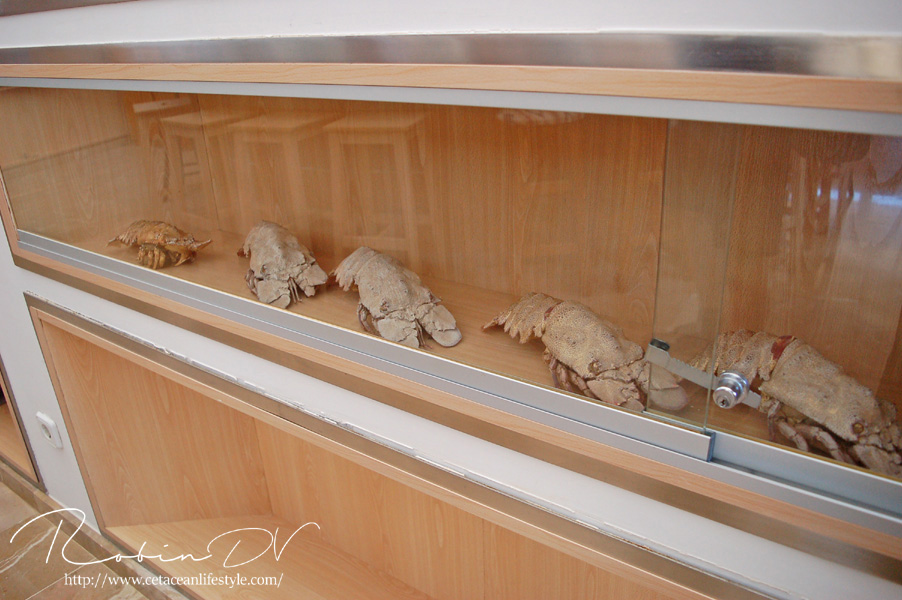 Wanneer je binnenloopt wordt je begroet door gethematiseerde rotswanden, die de hele route aanwezig blijven. Het eerste aquarium wat je tegen komt is ook meteen het grootste. Dit is een nagebootste pier van Cabrera. Compleet met allerlei grote lokale vissen zoals goudbrasems en papegaaivissen. Je hoort de zee brullen en het wordt donkerder afhankelijk van de diepte waar je naartoe gaat. Hierna kom je in een ruime met een groot scherm, waar een introductie film te zien is over het natuurpark Cabrera. Compleet met hoe het is ontstaan, de geschiedenis van de bewoners en de flora en fauna die er voorkomt. Vervolgens loop je verder langs aquaria van allerlei verschillende maten. De opzet is erg creatief, met verschillende vormen zoals buizen en bolvormige aquaria, maar ook rotspoelen en een aantal wrakken in het midden van de ruimte. Educatie is ook ruimschoots aanwezig, al miste ik wel echte uitleg of specifieke soortenbordjes bij veel van de aquaria. De gehele uitstraling van het aquarium is met name educatief, maar de thematisering maakte het ook erg meeslepend, alsof je een duik maakt in het gebied zelf. In het midden van de route was ook een soort laboratorium aanwezig. Hier kunnen kinderen waarschijnlijk interactieve programma's volgen. Er waren wat vitrinekasten te zien met de lokale dieren, een kleine expositieruimte, een maquette van de eilandengroep en ook educatie over het opvangen en rehabiliteren van zeeschildpadden. In verschillende aquaria is er een selectie van dier- en plantensoorten zoals die voorkomen voor de kust van Mallorca. Je kunt er de klassieke soorten zien zoals grote wrakbaarzen, trekkervissen, murenes en zelfs kleine haaien. Ook kun je er echter zeldzamere soorten zien die echt specifiek zijn voor de kust Mallorca of zelfs specifiek voor Cabrera zelf. Denk hierbij aan lokale vissen, sponskrabben en ook de beerkreeft! Boven: Een uitgebreide collectie van lokale flora en fauna die voorkomt rondom Mallorca en het natuurgebied van Cabrera, educatie staat centraal.