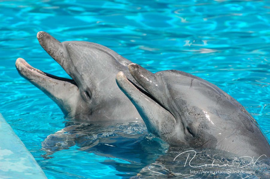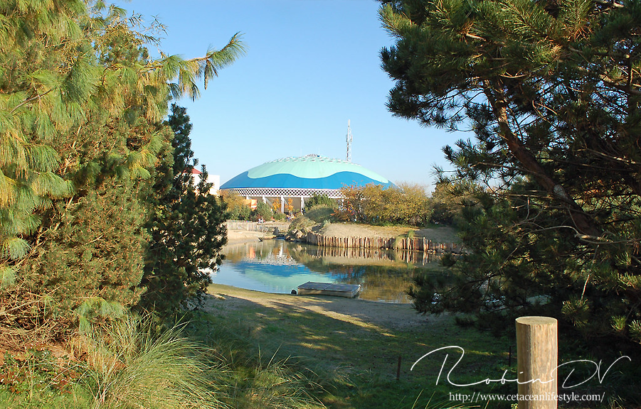 Wanneer je ooit een dolfinarium of ander dierenpark met dolfijnen hebt bezocht of zelfs een boottocht hebt gemaakt om wilde dolfijnen te zien valt je misschien wel iets op: Veel dolfijnen zitten onder de krasjes, wondjes en andere plekken. Het ene dier misschien meer dan het andere, maar het is duidelijk zichtbaar. Dit is niet omdat ze zich hebben bezeerd aan een rots of de omgeving; de dieren doen dit bij elkaar! Dolfijnen en andere cetacea hebben geen handen. Dit betekent dat wanneer ze door middel van aanraking of lichaamstaal willen communiceren dit met de bek moet worden gedaan. Dat doen dolfijnen dan ook regelmatig. Niet alleen communiceren ze door elkaar te bijten, duwen of butsen met zowel de snuit als het hele lichaam, maar ze tasten zo ook hun omgeving af. Je ziet dan ook vaak dat de snuitpunt van een dolfijn een stuk lichter is dan de rest van het lichaam en een andere textuur heeft. Regelmatig zit er ook een wondje op de kin veroorzaakt door het aftasten van de omgeving. Dolfijnen communiceren duidelijk en lomp! Ze gooien hun hele lichaam in de strijd bij het stoeien, vechten of zelfs bij gewone communicatie of een ontmoeting tussen twee dieren. Ook halen ze hun bek langs het lichaam van andere dieren die voorbij zwemmen. Zo ontstaan de langere en diepere krassen die je soms kunt zien. Het merendeel van de 'ruige' communicatie die zichtbare krassen en plekken veroorzaakt gaat over de hiërarchie in de groep. Oftewel wie op welke plek staat en het zorgen dat hij/zij ook op deze plek blijft. Dat lijkt misschien lomp of zielig, maar dit is normaal en hoe deze dieren communiceren. Zowel in het wild als onder menselijke zorg. Een dolfijn volledig zonder krassen (en dan ook echt met geen één krasje) is waarschijnlijk zieliger aangezien dat duidt op dat hij/zij nooit sociaal contact heeft gehad met andere dieren. Deze krassen worden benoemd met de term "rakemarks". Rakemarks zijn dus krassen veroorzaakt van dier op dier. Deze zijn ook op de dieren in het Dolfijndomijn zichtbaar, aangezien er in de groep ook dieren leven met al een behoorlijke leeftijd zal het bij de één beter te zien zijn dan bij de ander. Ik stel de dieren graag aan jullie voor! Boven: Een impressie van het leefgebied Dolfijndomijn, voorheen 'de Koepel' dat werd geopend in 1968 en de groep mannelijke tuimelaars die hier leven.