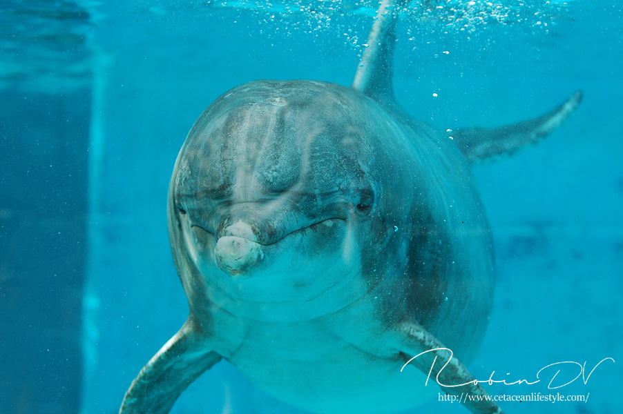 Hmmm wacht eens even? Balasi staat ook in mijn blog over de dolfijnen uit de Dolfijnendelta dit jaar?? Zijn er twee Balasi's in het Dolfinarium? Nee hoor! Balasi is dit jaar verhuisd naar het Dolfijndomijn. Dit heeft vooral zijn huid heel erg goed gedaan! Als je de foto's vergelijkt zie je dat de vlekken op zijn lichaam bijna helemaal verdwenen zijn! Balasi is een Franse dolfijn van origine. Hij werd geboren op 16 augustus 2004 in Parc Asterix. Zijn moeder is Beauty en zijn vader is Pichi. Dit maakt hem dus ook de halfbroer van dolfijn Liya in de Dolfijnendelta. Balasi verhuisde op 8 november 2012 van Parc Asterix naar het Dolfinarium. Hiervoor had hij echter in 2008 al enige tijd in het Dolfinarium doorgebracht. Dit was tijdens de renovatie van het bassin waarbij alle dolfijnen van Parc Asterix tijdelijk naar het Dolfinarium verhuisde. Hij heeft kleine donkere ogen en een dunne snuit. Het is een eigenwijze, maar erg lieve dolfijn volgens zijn trainers. Voorheen was hij voor beginners het makkelijkste te herkennen vanwege het grote aantal en formaat van de vlekken die hij op zijn lichaam had. Afhangend van het seizoen en de temperatuur lijken deze heftiger of vallen ze juist minder op. Nu hij weer in het Dolfijndomijn leeft zijn deze zo goed als afwezig.