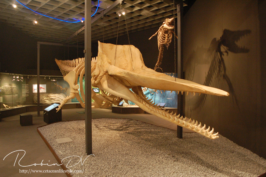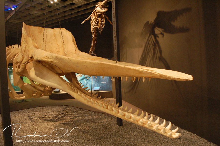 Boven: Replica van de uitgestorven roofpotvis "Leviathan melvillei".