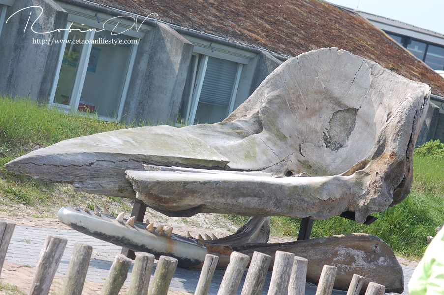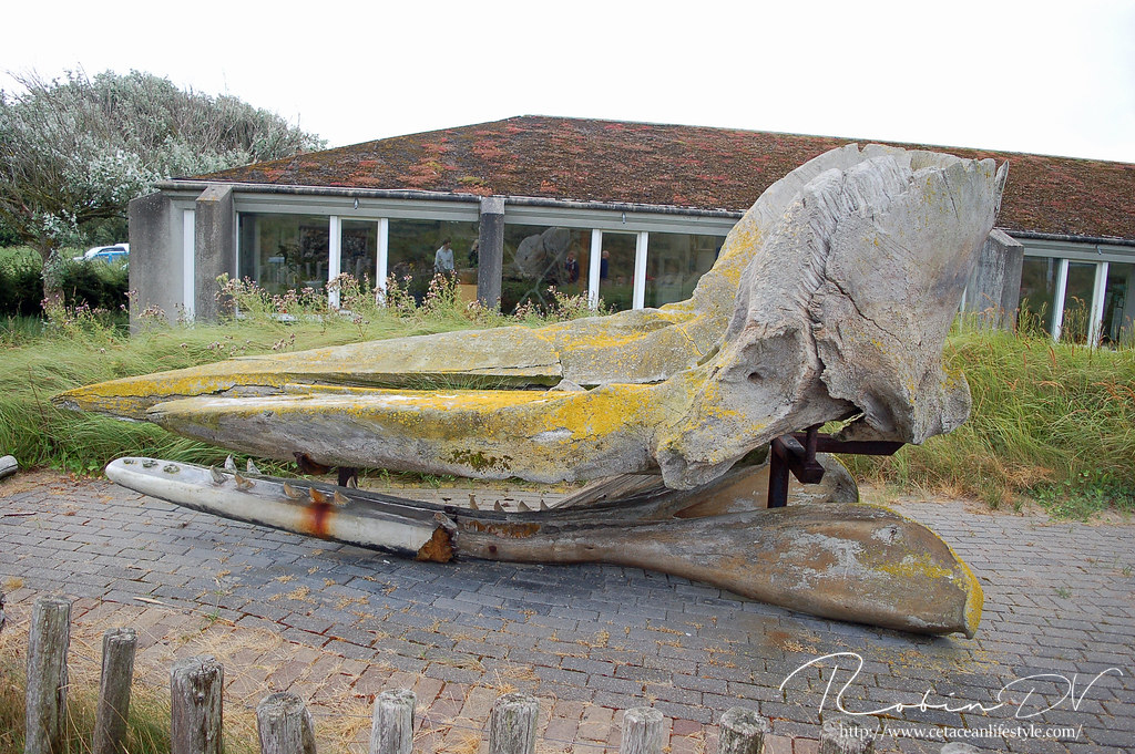 Mijn eerste langere vakantie weg van huis was naar Texel met mijn moeder en tante. Hier bezochten we zeehondenopvang en museum Ecomare, waar ik mijn eerste potvis in levende lijve zag. In Ecomare zijn twee potvissen te vinden. De eerste kom je meteen bij de ingang tegen. Dit vervallen skelet kent een rijke geschiedenis. Deze volwassen mannetjes potvis van 15 meter spoelde aan in 1953. Hij werd gevonden op het puntje van de Hors in verre staat van ontbinding. De complete bovenschedel ontbrak. Wat er over was van het dier werd naar Ecomare gebracht (toendertijds het Texels Museum). Ruim 25 jaar later, in 1978 ontdekt een visser een enorm bot ter hoogte van de Vliehors. Dit bleek de bovenschedel te zijn die matchte met dezelfde potvis! Na 25 jaar was het skelet dus eindelijk weer compleet! Er werd een compleet schaalmodel van het dier om de botten heen gebouwd. Ik heb dit model met eigen ogen gezien als kind en ik kan me nog goed herinneren dat dit heel veel indruk maakte op mij. Dit was de eerste 'echte walvis' die ik in het echt heb gezien. Bij de vernieuwing van het buitenterrein van Ecomare was er geen ruimte meer voor het model. De botten zijn daarom in hun oorspronkelijke staat bij de ingang op display gelegd. Helaas takelt het skelet nu op een snel tempo af omdat het wordt blootgesteld aan de elementen. De foto's hierboven zijn van verschillende jaartallen (ik bezoek Ecomare vrijwel ieder jaar) en je ziet dat het op iedere foto in een slechtere staat is. Door de jaren heen is het skelet verschillende keren bewerkt en hersteld. Ondanks dat hebben weer, wind en zout de botten aangetast. Ecomare heeft daarom gekozen om de botten nu in alle rust te laten vergaan.