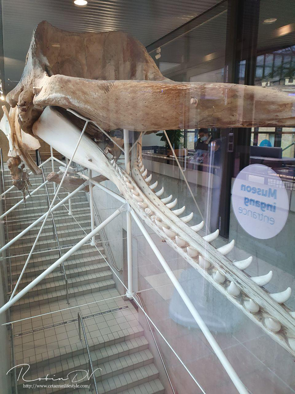 Tijdens een zeer hevige storm op 15 december 1979 spoelde er een mannelijke potvis aan in Egmond aan Zee. Dit was destijds een hele happening en er wordt geschat dat wel tienduizenden mensen zijn gaan kijken naar het gestrande dier. De toenmalige directeur van het Museon wist de dode potvis voor zijn museum te bemachtigen. Er werd drie dagen en nachten gewerkt om het kadaver te ontleden en af te voeren. De reconstructie was een tijdrovende klus, omdat het skelet in vele stukken uiteen was gevallen. Dit kun je ook goed zien aan het skelet, dat met meerdere schroeven, stangen en andere constructies vast is gemaakt zodat het niet uit elkaar valt. De preparatie nam bijna een jaar in beslag. Het werd het eerste complete opgestelde skelet van een potvis in Nederland. Het skelet is 14,20 meter lang, de schedel 4,75 meter. De breedte van de staart is 4 meter. Deze potvis was levend zo'n 15,22 meter lang. Het staat nog steeds in het Museon in Den Haag. Hier is het te vinden in de ontvangsthal, vlakbij de ingang van de vergaderlounge. Je kunt dit dier letterlijk vanuit het verkeer zien hangen en je hoeft geen entree voor het museum te betalen om hem te kunnen bewonderen.