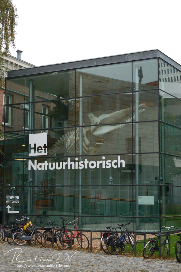 De potvis van het Museon is ook vanaf de buitenkant van het gebouw heel goed te zien. Schroeven en stangen houden het skelet bijeen.